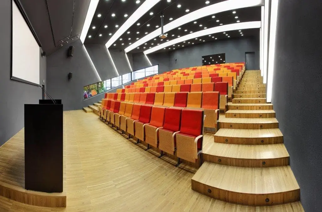 Dodatkowo salą można sterować za pomocą intuicyjnego panelu dotykowego, który pozwala kontrolować oświetlenie, nagłośnienie oraz sprzęt wizualny. Dzięki temu każda prezentacja czy wystąpienie przebiega w komfortowych warunkach.