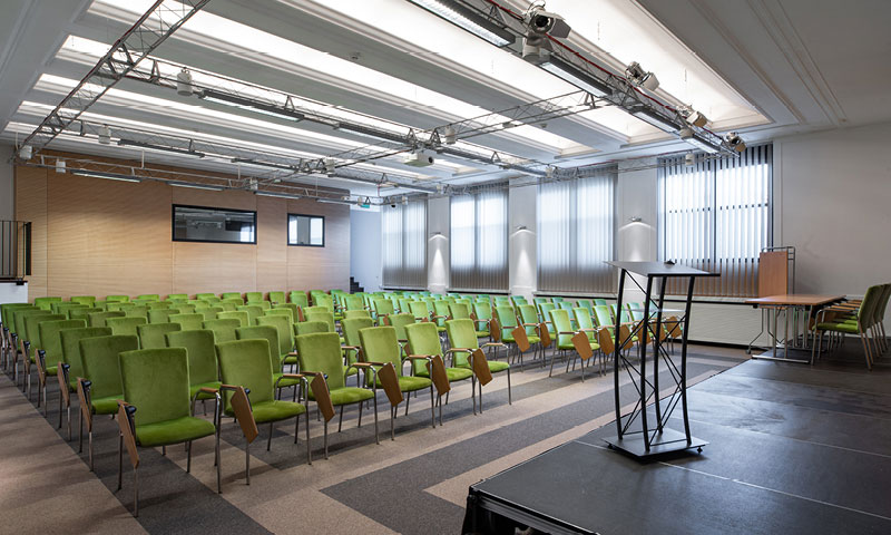 Już sam widok modernistycznej bryły budynku, z odrestaurowaną fasadą i eleganckim dziedzińcem, sugeruje, że w środku czeka przestrzeń zaprojektowana z myślą o profesjonalnych wydarzeniach. Każdy detal, od architektury po aranżację sal, tworzy atmosferę sprzyjającą spotkaniom, w których liczy się jakość i komfort.