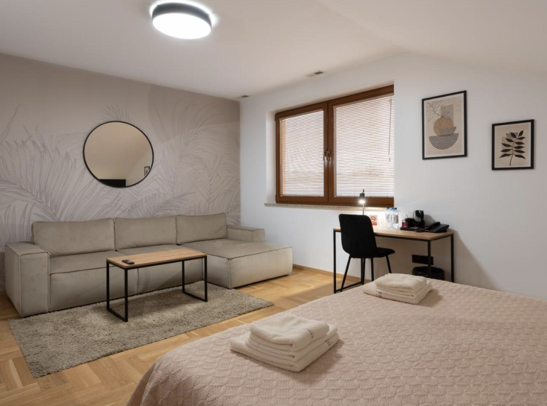 Hotel oferuje 45 klimatyzowanych pokoi, które zapewniają łącznie 98 miejsc noclegowych. To komfortowe zaplecze dla uczestników konferencji, prelegentów oraz kadry zarządzającej. Pokoje wyposażono w ergonomiczne biurka, szybki internet, zestawy do parzenia kawy i herbaty oraz nowoczesne łazienki, co sprzyja zarówno odpoczynkowi, jak i pracy po godzinach.