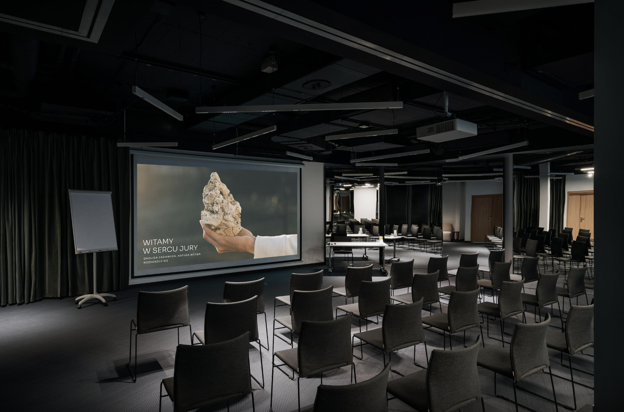 Nowoczesne, a jednocześnie przytulne wnętrza korespondują z jurajskim krajobrazem, a panoramiczne okna w części pokoi potęgują poczucie bliskości natury. Niektóre z nich przystosowano do praktyki jogi i medytacji - rozwiązanie doceniane szczególnie podczas kilkudniowych pobytów konferencyjnych.