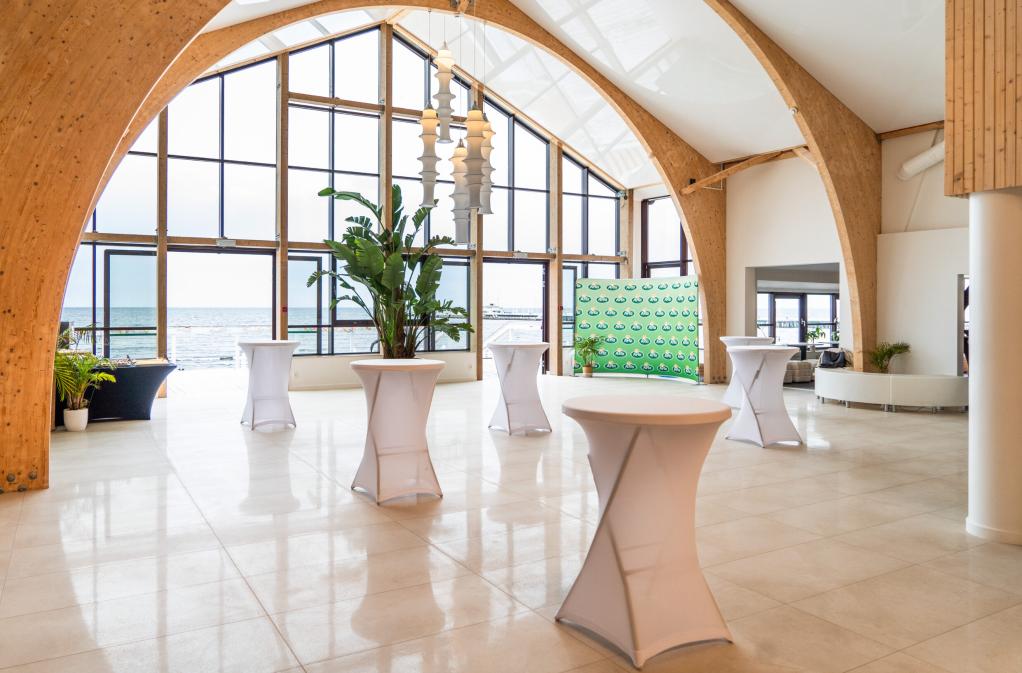Obiekt oferuje dwie przeszklone sale eventowe o łącznej powierzchni 1000 metrów kwadratowych. Ich panoramiczne przeszklenia zapewniają gościom niezakłócony widok na morze i naturalne światło, które dodaje wydarzeniom wyjątkowego charakteru. Wysokie wnętrza, ozdobione drewnianymi łukami i organicznymi formami, tworzą przestrzeń, która sprzyja zarówno eleganckim bankietom, jak i nowoczesnym konferencjom.