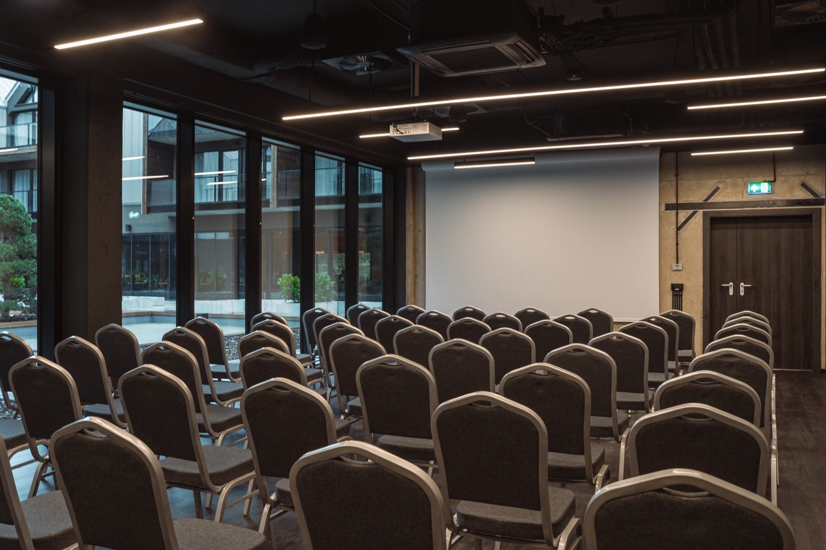 Największa konfiguracja pozwala zorganizować spotkanie dla około 180 uczestników. Przestrzenie są jasne, ergonomiczne i wyposażone w nowoczesny sprzęt audiowizualny, co sprzyja płynnej pracy zespołów i prowadzeniu wymagających prezentacji. Dzięki dużym przeszkleniom podczas spotkań można korzystać z naturalnego światła oraz widoków na otaczającą przyrodę.