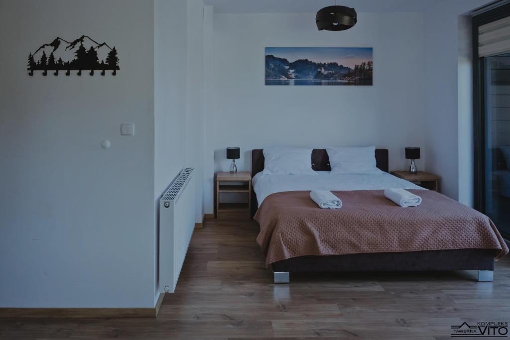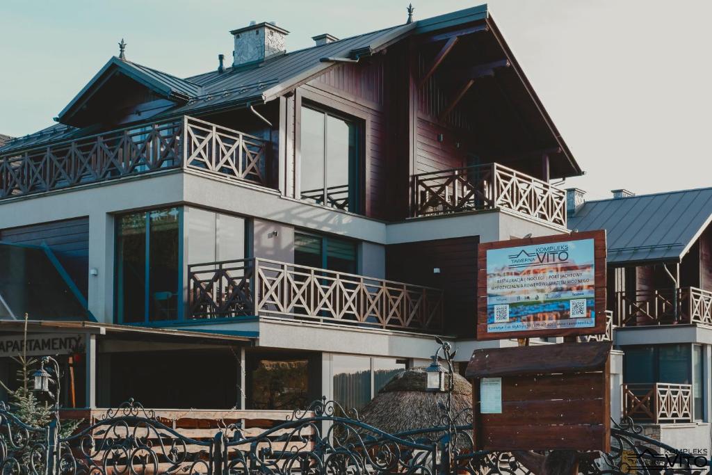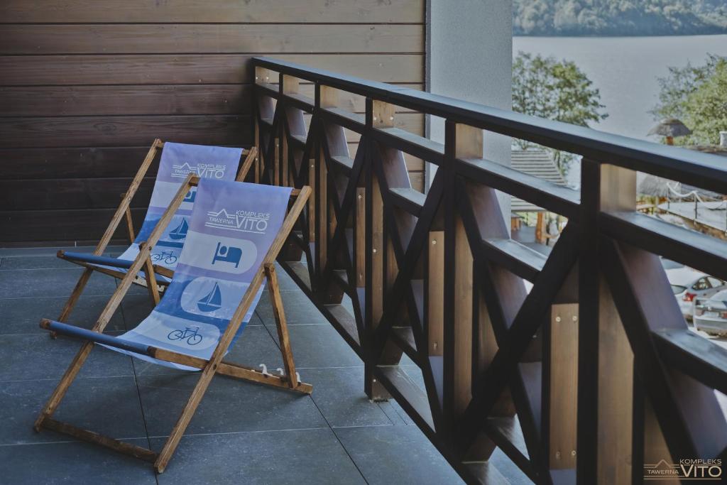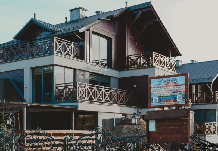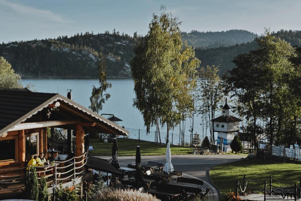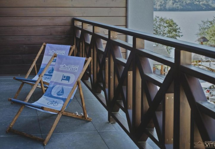 Część noclegowa Kompleksu Tawerna Vito mieści się w nowoczesnym budynku usytuowanym bokiem do linii brzegowej. Duże przeszklenia oraz prywatne tarasy otwierają przestrzeń na panoramę Jeziora Czorsztyńskiego i otaczające je pasma górskie.