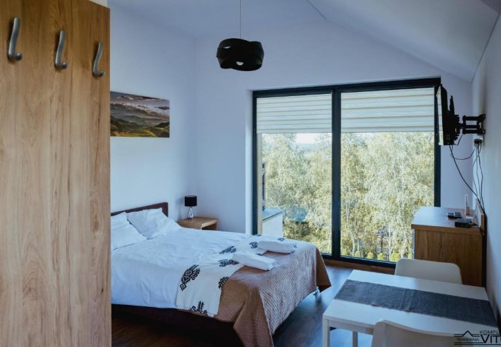 Apartamenty są nowoczesne, klimatyzowane i zaprojektowane tak, by maksymalnie wykorzystać widok na Jezioro Czorsztyńskie i okoliczne pasma górskie. Bardzo duże przeszklenia i tarasy robią wrażenie szczególnie o poranku lub przy zachodzie słońca. Lokalizacja w pobliżu Osady Czorsztyn nadaje miejscu dodatkowy klimat. To przestrzeń, w której faktycznie chce się zostać dłużej niż jedną noc po konferencji.
