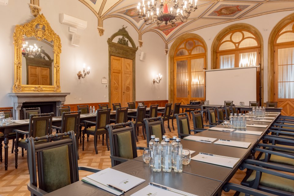 Do dyspozycji firm oddano pięć sal konferencyjnych o zamkowej charakterystyce, które zachwycają pięknymi detalami dekoracyjnymi, zdobionymi sufitami, łukowatymi przejściami i dużymi oknami z widokiem na ogród. Każda z sal została wyposażona w sprzęt audiowizualny oraz nagłośnienie bezprzewodowe. Ich różnorodna powierzchnia pozwala dobrać przestrzeń do wielkości i rodzaju spotkania. Największa sala szkoleniowo-konferencyjna pomieści nawet do 140 osób (w układzie kinowym).