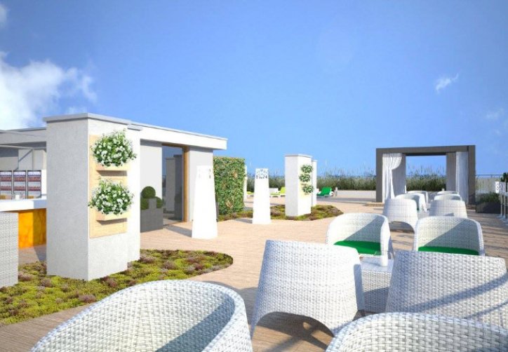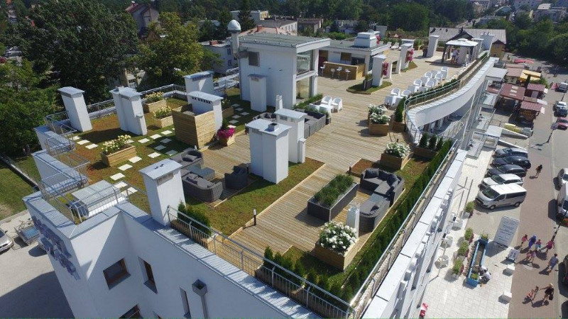 Na dachu hotelu znajduje się taras widokowy i miejsca relaksu.