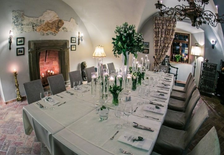 Zamek Karpniki oferuje również organizację kolacji grupowych. Po zakończonej konferencji Goście mogą wspólnie celebrować wieczór przy wyśmienitych daniach przygotowanych przez Szefową Kuchni. Wystarczy przesłać preferencje żywieniowe drogą mailową, a zespół przygotuje propozycję menu dopasowaną do okazji.
