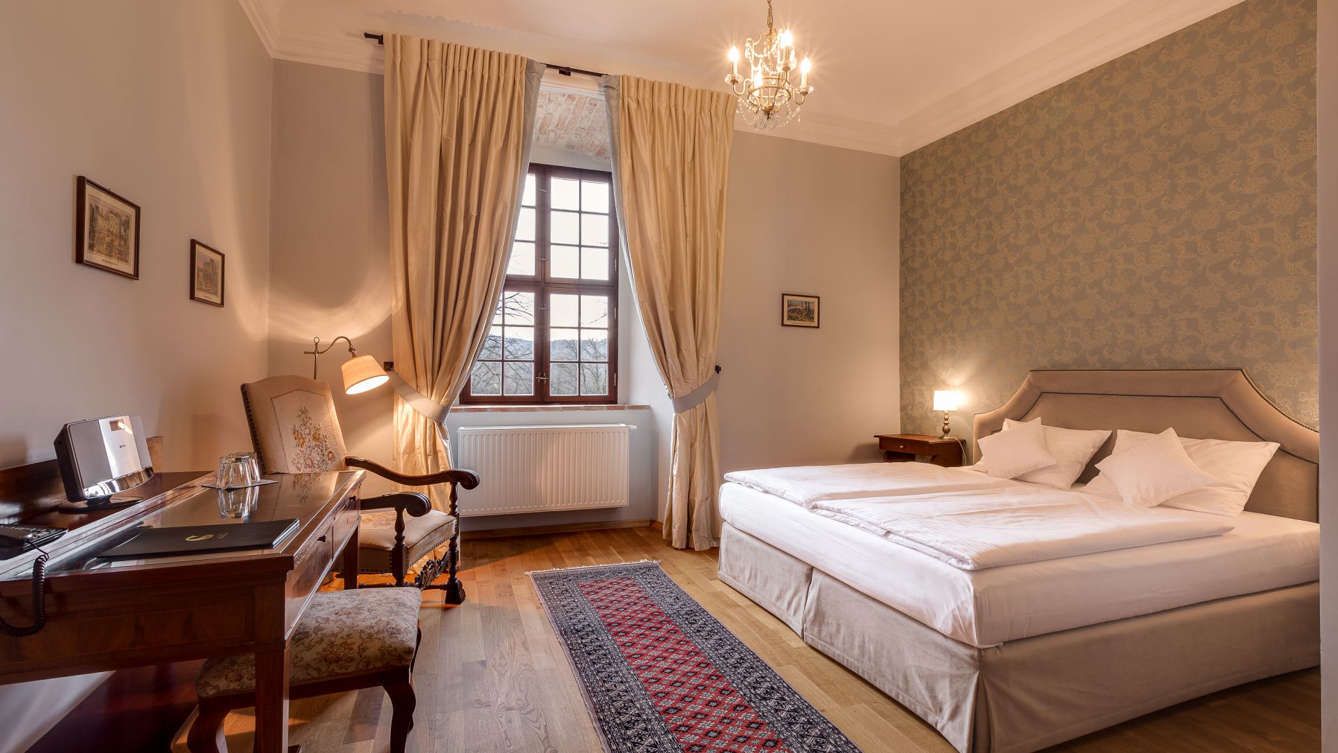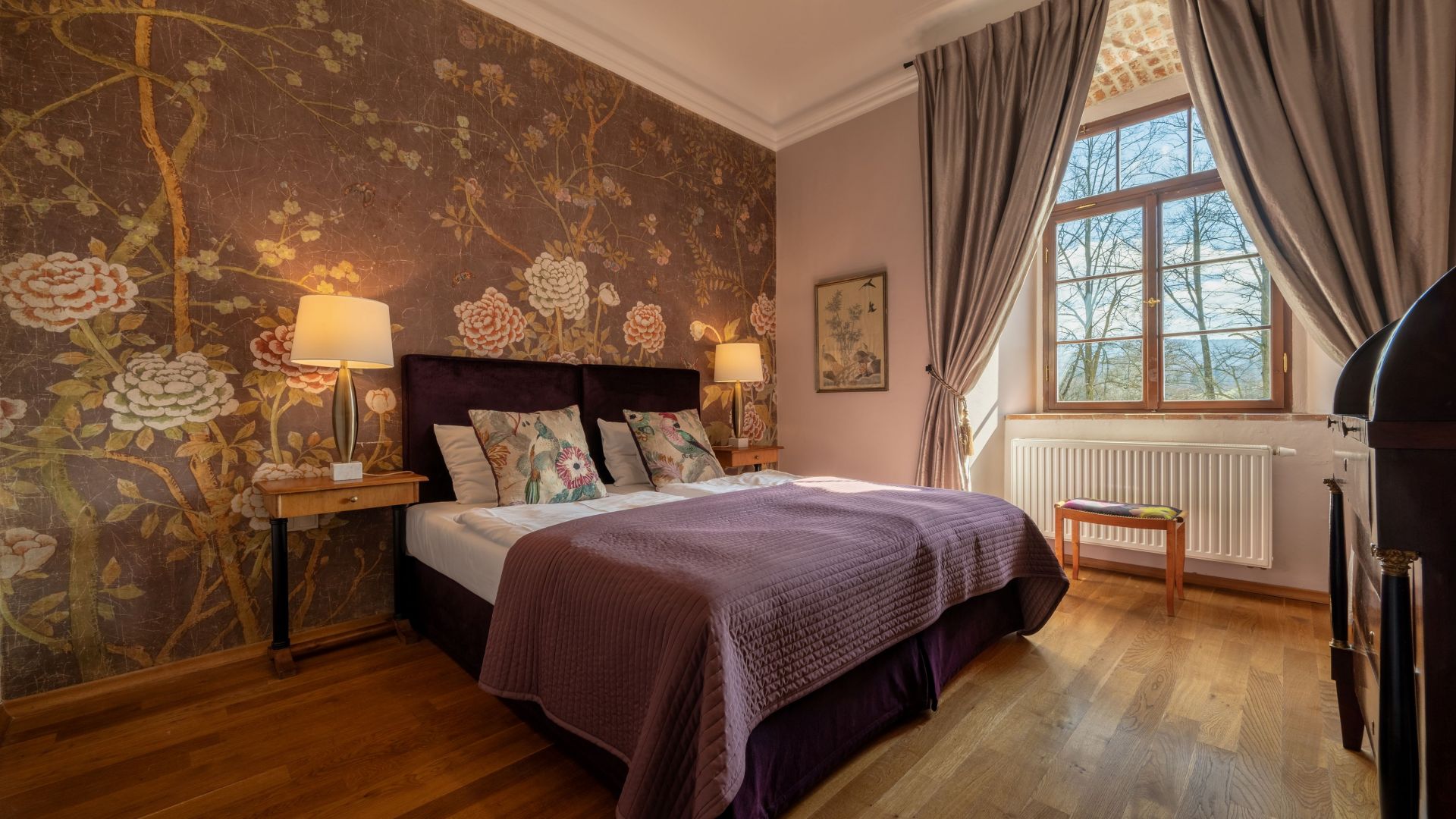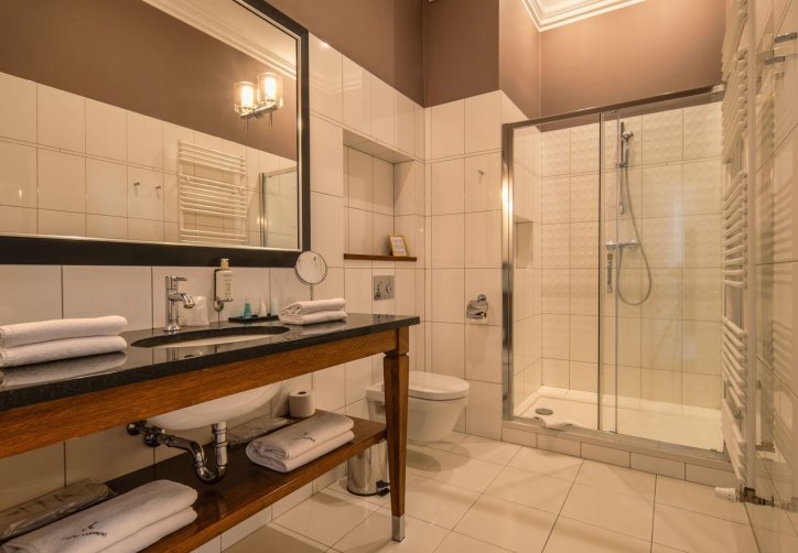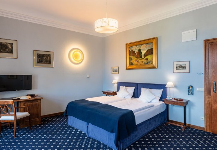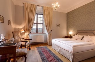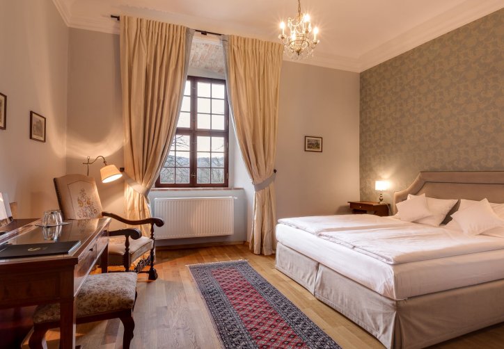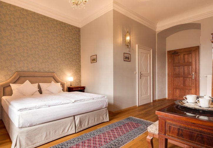 Stylowe pokoje i apartamenty w Zamku Karpniki to miejsca, w których historyczny klimat łączy się z wygodą. Każde wnętrze nawiązuje do dawnych epok, a spokojne kolory i starannie dobrane detale tworzą przytulną, zamkową atmosferę. Wszystkie pokoje znajdują się w głównym budynku, więc każdy Gość może naprawdę poczuć wyjątkowy charakter tego miejsca. Różne standardy i lokalizacje na piętrach pozwalają wybrać idealny wariant pobytu.