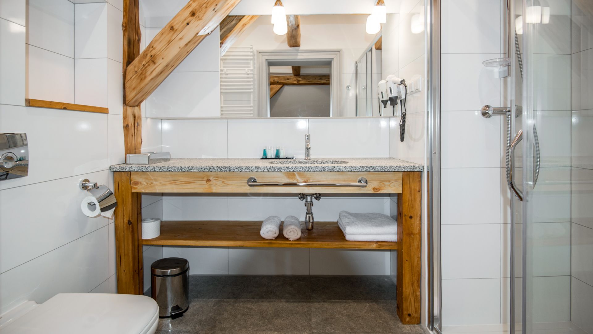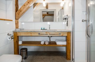 W łazience dostępny jest prysznic, a w zależności od wybranego pokoju – jedno łóżko podwójne lub dwa osobne, aby zapewnić spokojny i wygodny sen.