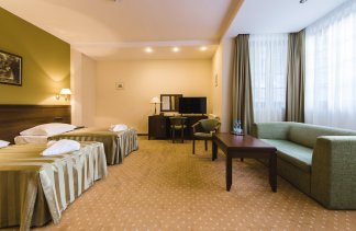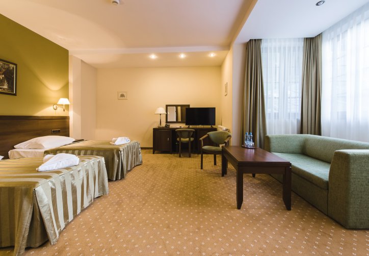 Hotel oferuje szeroki wybór pokoi dopasowanych do różnych potrzeb, od przytulnych pokoi standardowych po luksusowe studia VIP Superior i Premium. Każdy pokój wyposażony jest w sejf, mini-chłodziarkę, telewizor, suszarkę do włosów oraz szybki internet. Obiekt może zakwaterować grupy firmowe w komfortowych warunkach.