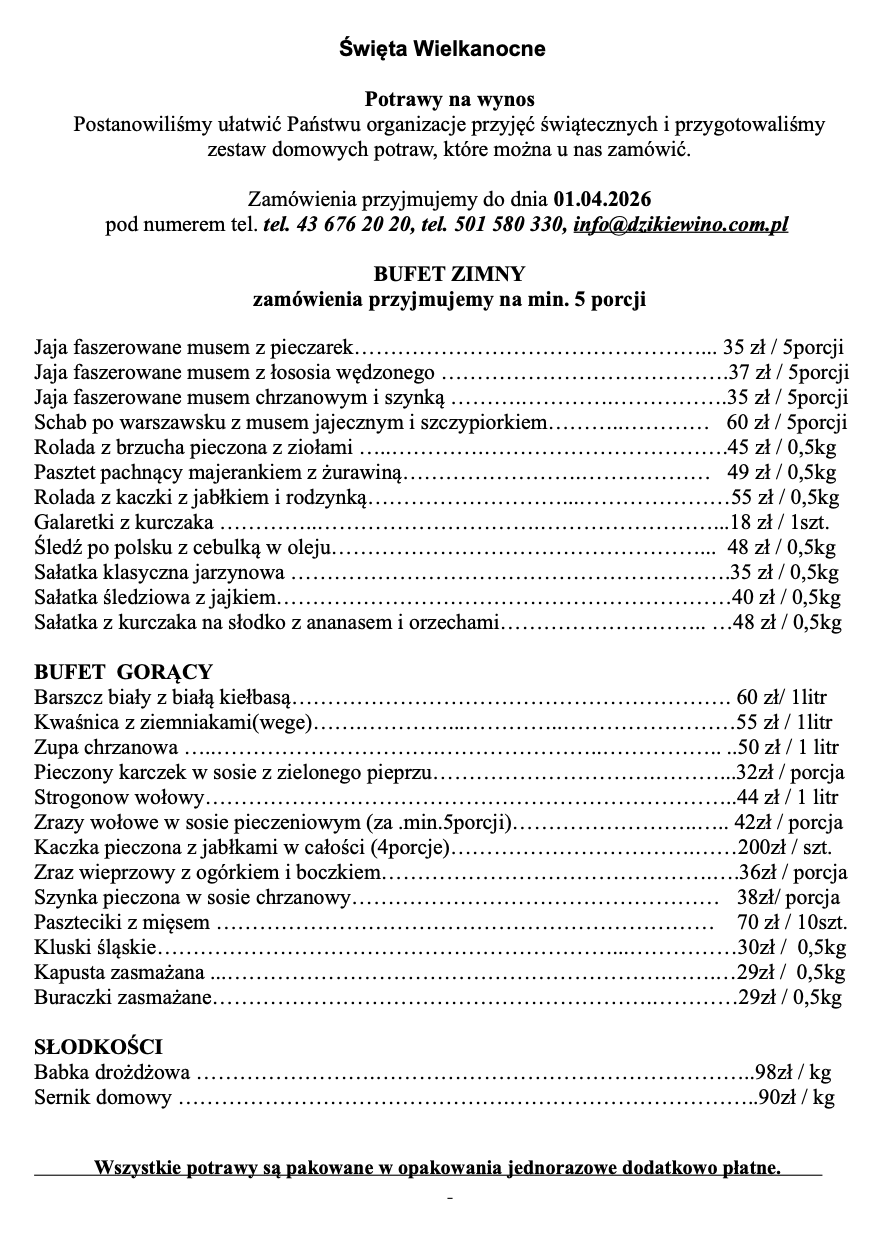 Centrum konferencyjno-wypoczynkowe "Dzikie Wino" posiada cztery sale bankietowe oraz restaurację, które umożliwiają organizację przyjęć dla nawet 150 osób. Menu jest zawsze dostosowywane indywidualnie, co gwarantuje wysoką jakość kulinarną i elastyczność.