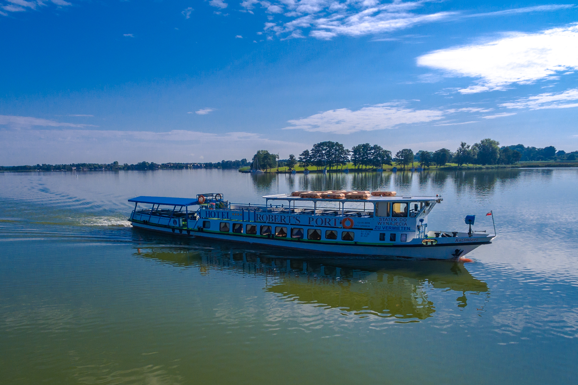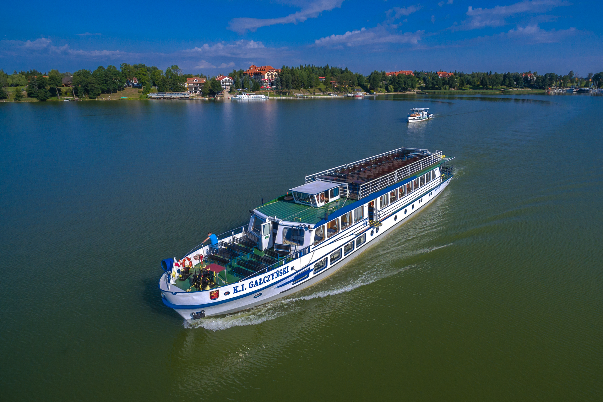 - Statek K. I. Gałczyński - w eleganckich wnętrzach można zorganizować event nawet dla 250 osób. Na pokładzie znajdują się dwie restauracje dla 180 osób. Dużym atutem jest również taras na 2. piętrze, który pozwala pasażerom podziwiać mazurskie widoki