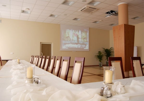 Sala konferencyjno - szkoleniowa wyposażona jest w niezbędny sprzęt multimedialny (rzutnik, ekran, nagłośnienie - mikrofony bezprzewodowe, wizualizer avermedia).