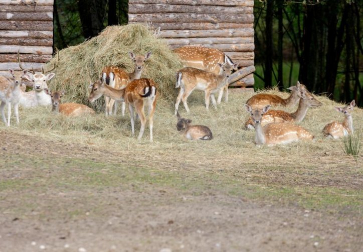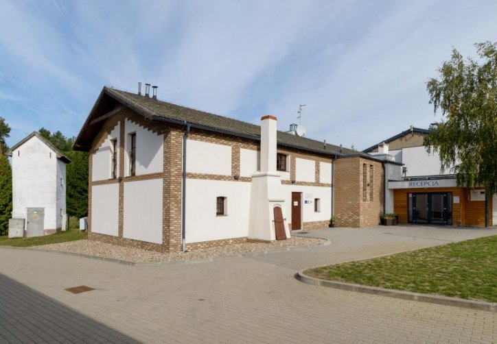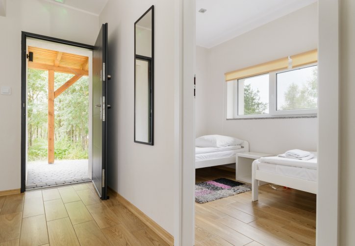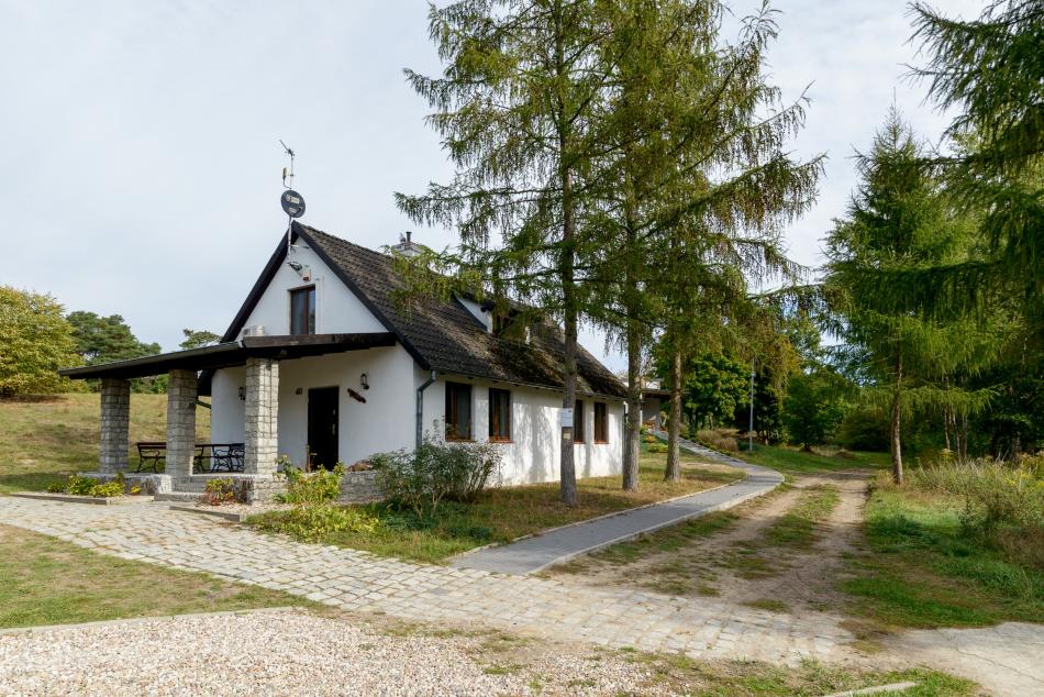 - Domek myśliwski – przestronny, całoroczny obiekt z klimatyzacją na piętrze. Na parterze znajdują się trzy sypialnie dwuosobowe, łazienka oraz pokój dzienny z aneksem kuchennym. Piętro mieści dodatkowe dwie sypialnie dwuosobowe i drugą łazienkę. Przed domkiem zlokalizowany jest zadaszony taras wyposażony w ławki i stół, idealny do wspólnego biesiadowania na świeżym powietrzu.