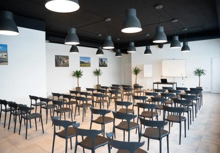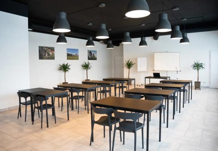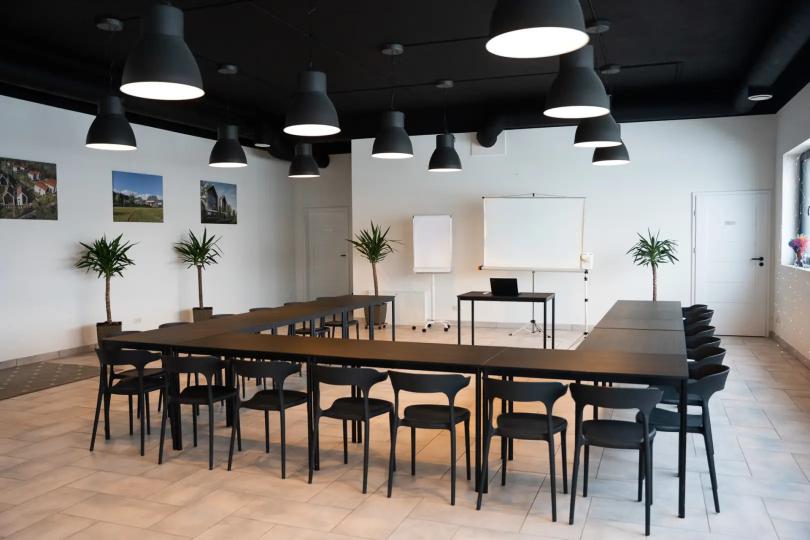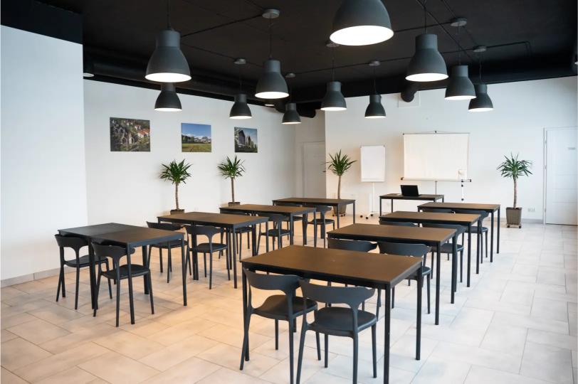 Możliwość dowolnej aranżacji wnętrza umożliwia przygotowanie sali m.in. na konferencje, szkolenia, warsztaty czy spotkania biznesowe. Układ stołów i krzeseł może być dostosowany do formuły wydarzenia – od ustawienia teatralnego, przez szkolne, po bankietowe lub inne indywidualne konfiguracje. Dodatkowym atutem jest opcja pełnego zaciemnienia sali, zapewniająca idealne warunki do pracy z materiałami multimedialnymi i prowadzenia prezentacji.
