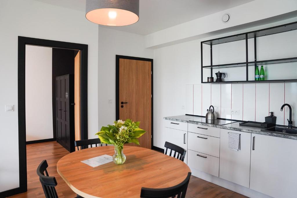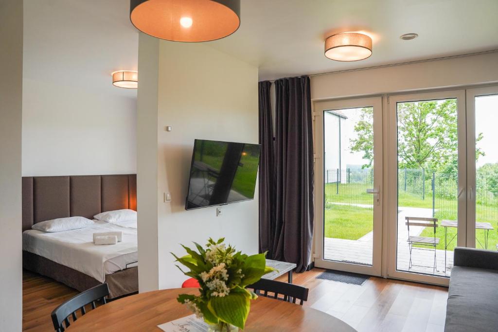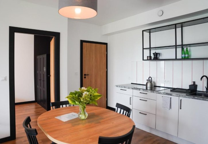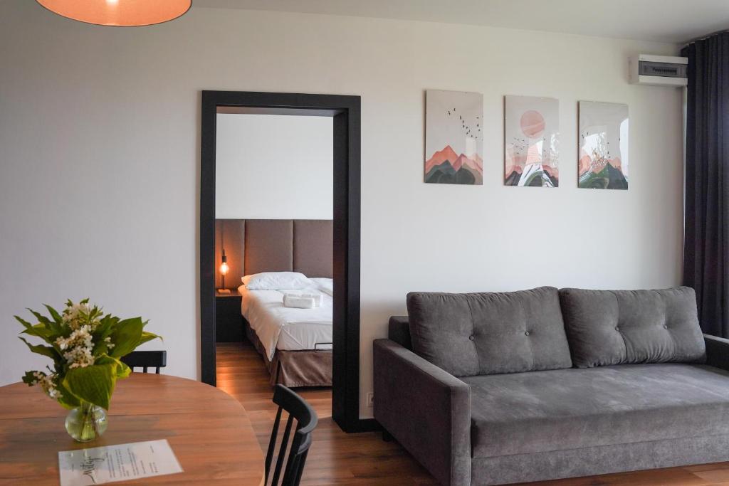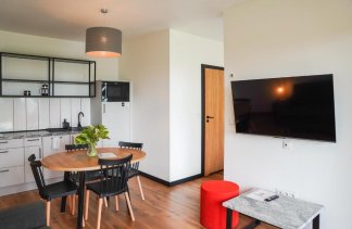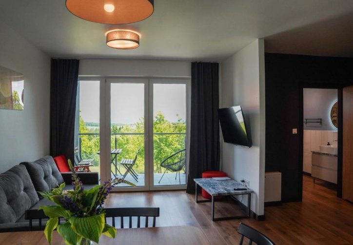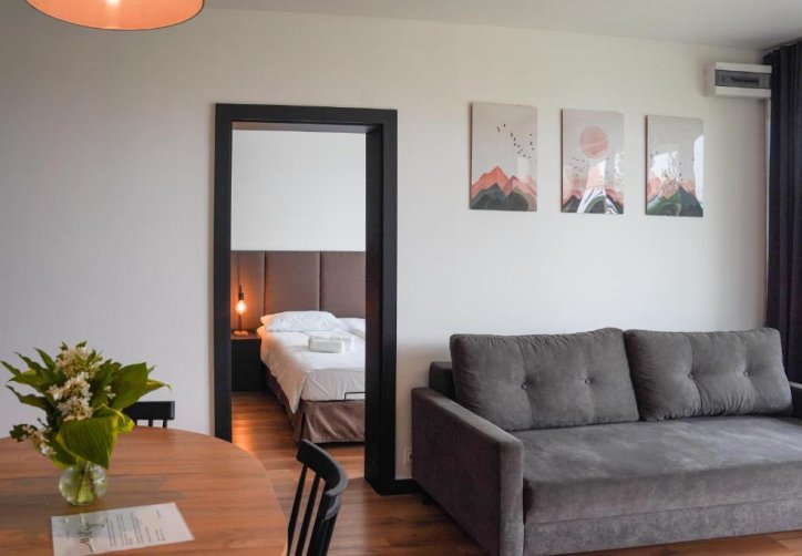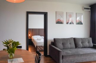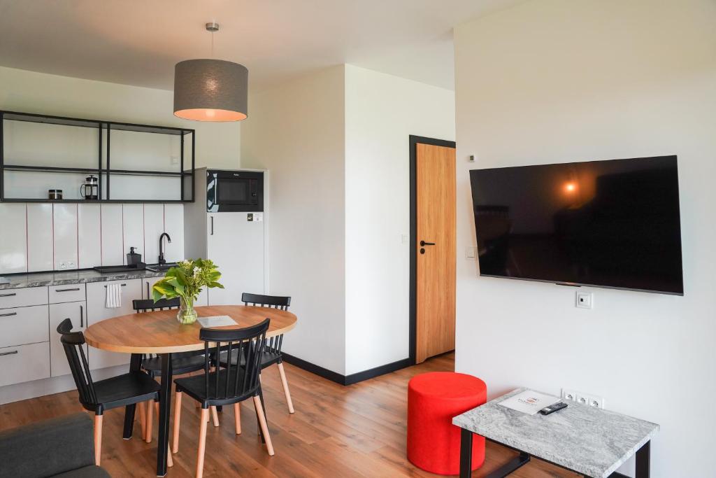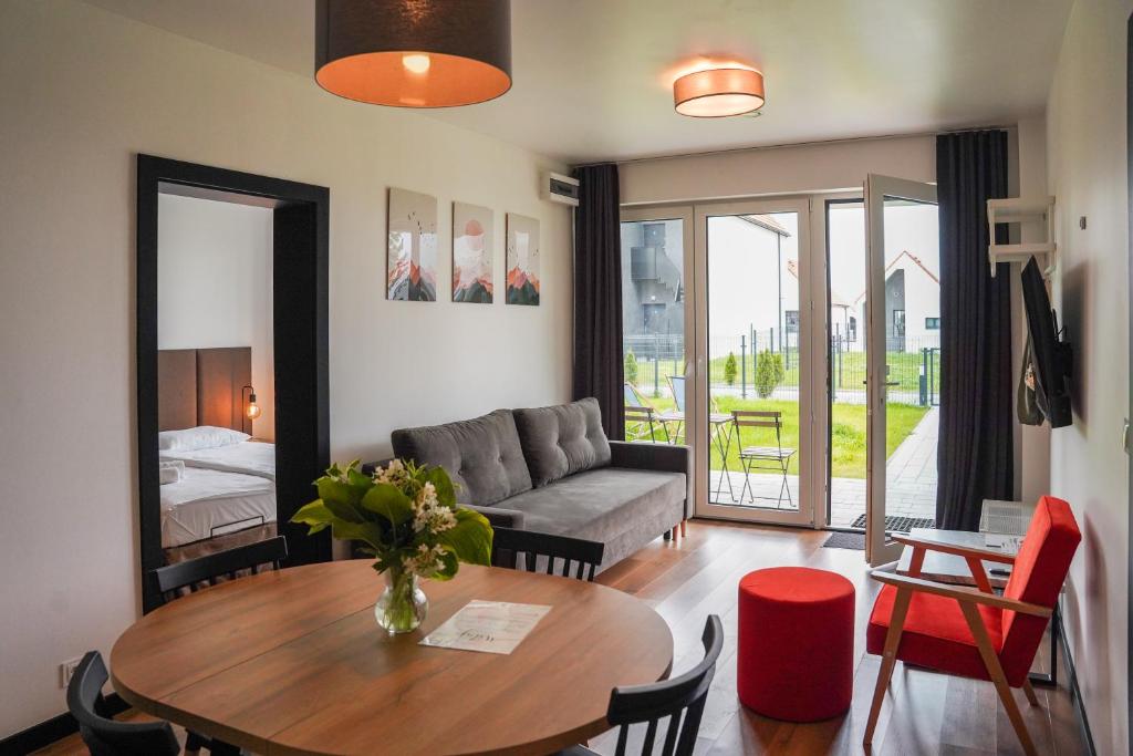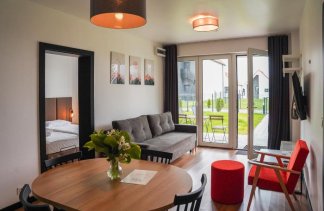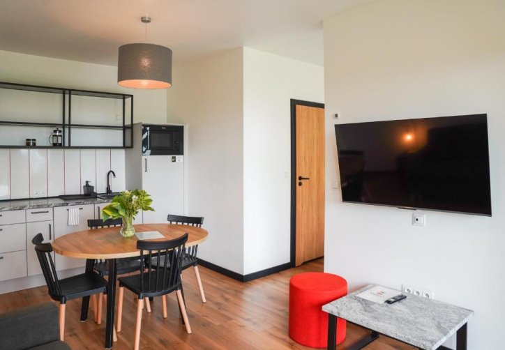 Każdy apartament posiada przestronny salon z rozkładaną sofą oraz telewizorem, a także w pełni wyposażony aneks kuchenny z dużym stołem, umożliwiający swobodne przygotowywanie i spożywanie posiłków. W standardzie pobytu zapewniono pościel, ręczniki oraz zestaw kosmetyków.
