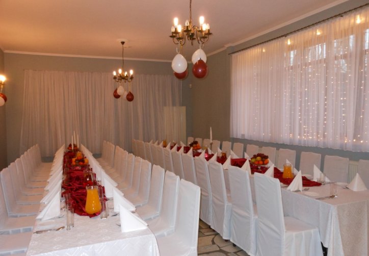 Organizujemy wesela, przyjęcia, bankiety na trzech klimatyzowanych salach mieszczących do 150 osób, a także konferencje i szkolenia na sali konferencyjnej mieszczącej do 40 osób.