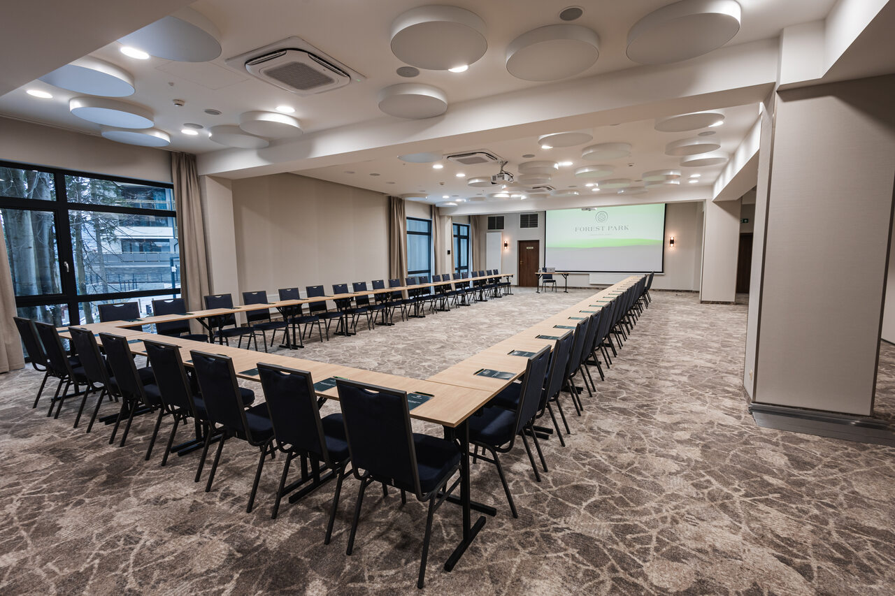 Forest Park Resort & SPA oferuje przestronną przestrzeń konferencyjną, która obejmuje dwie sale konferencyjno-eventowe – Dębową i Bukową – o łącznej powierzchni 563 metrów kwadratowych. W zależności od układu, obiekt może pomieścić do 600 osób w układzie teatralnym, do 466 osób w układzie bankietowym, a także do 390 osób w układzie szkolnym. Dzięki mobilnym ścianom, przestrzeń może być dostosowana do kilku wydarzeń jednocześnie.