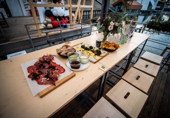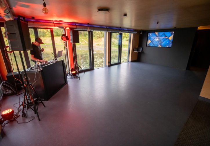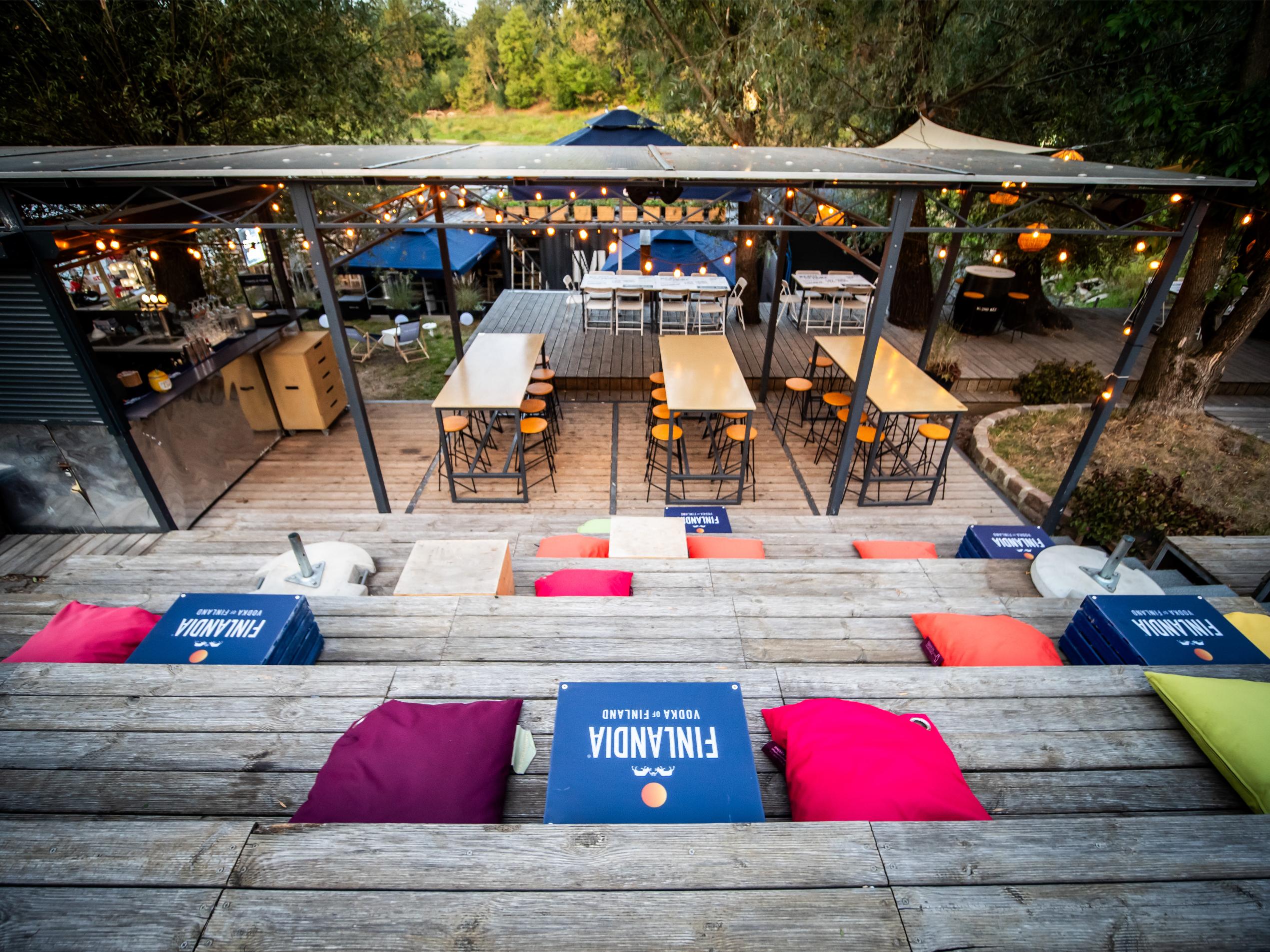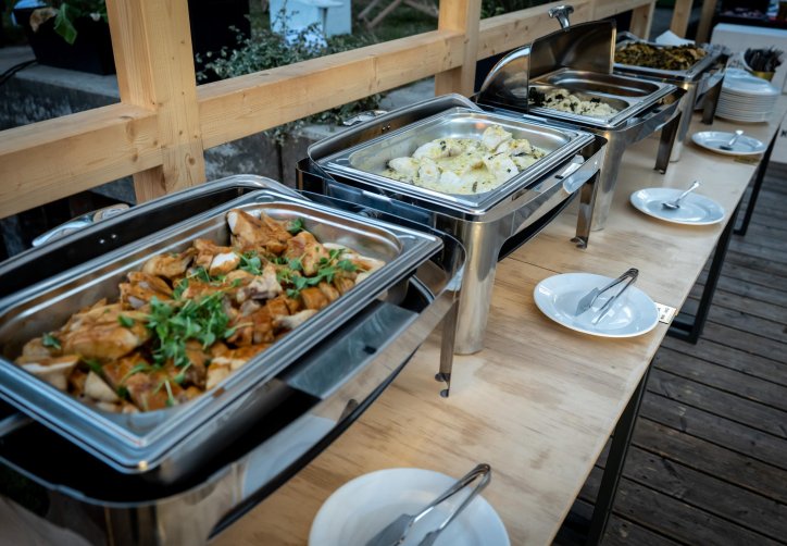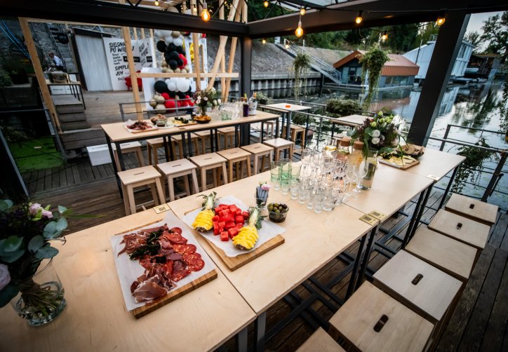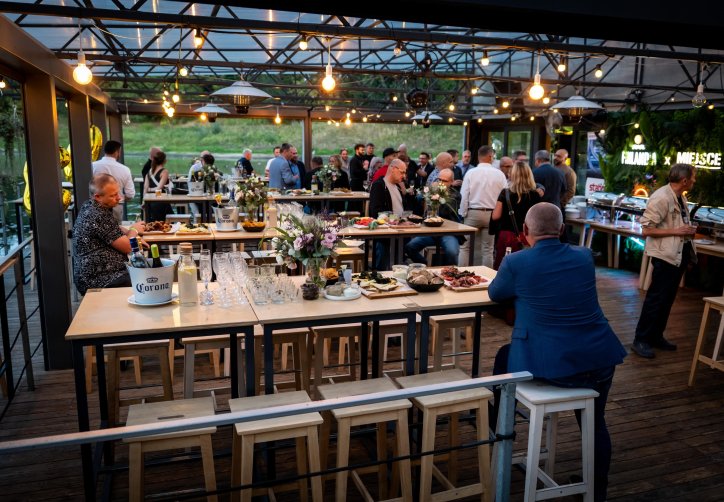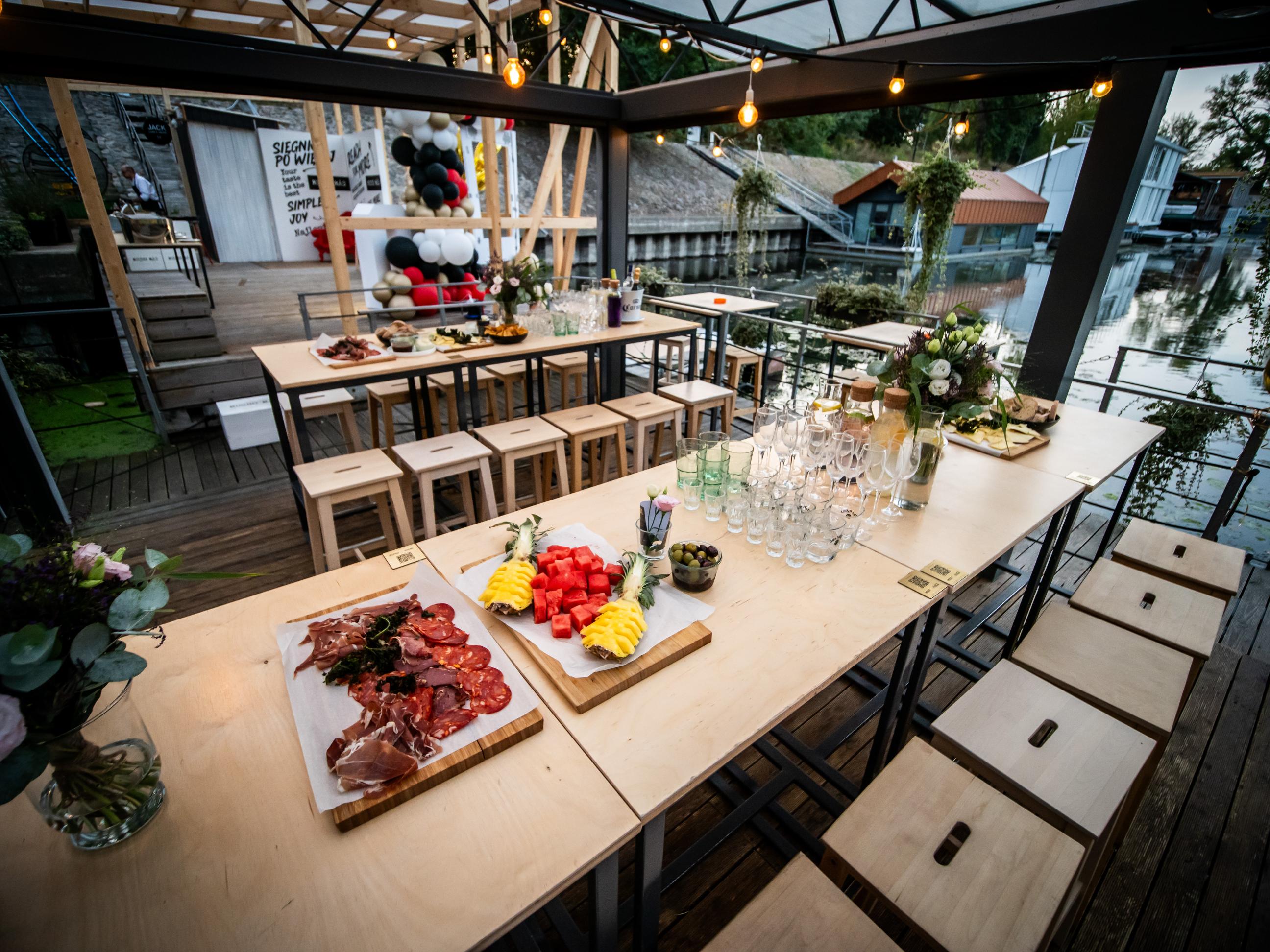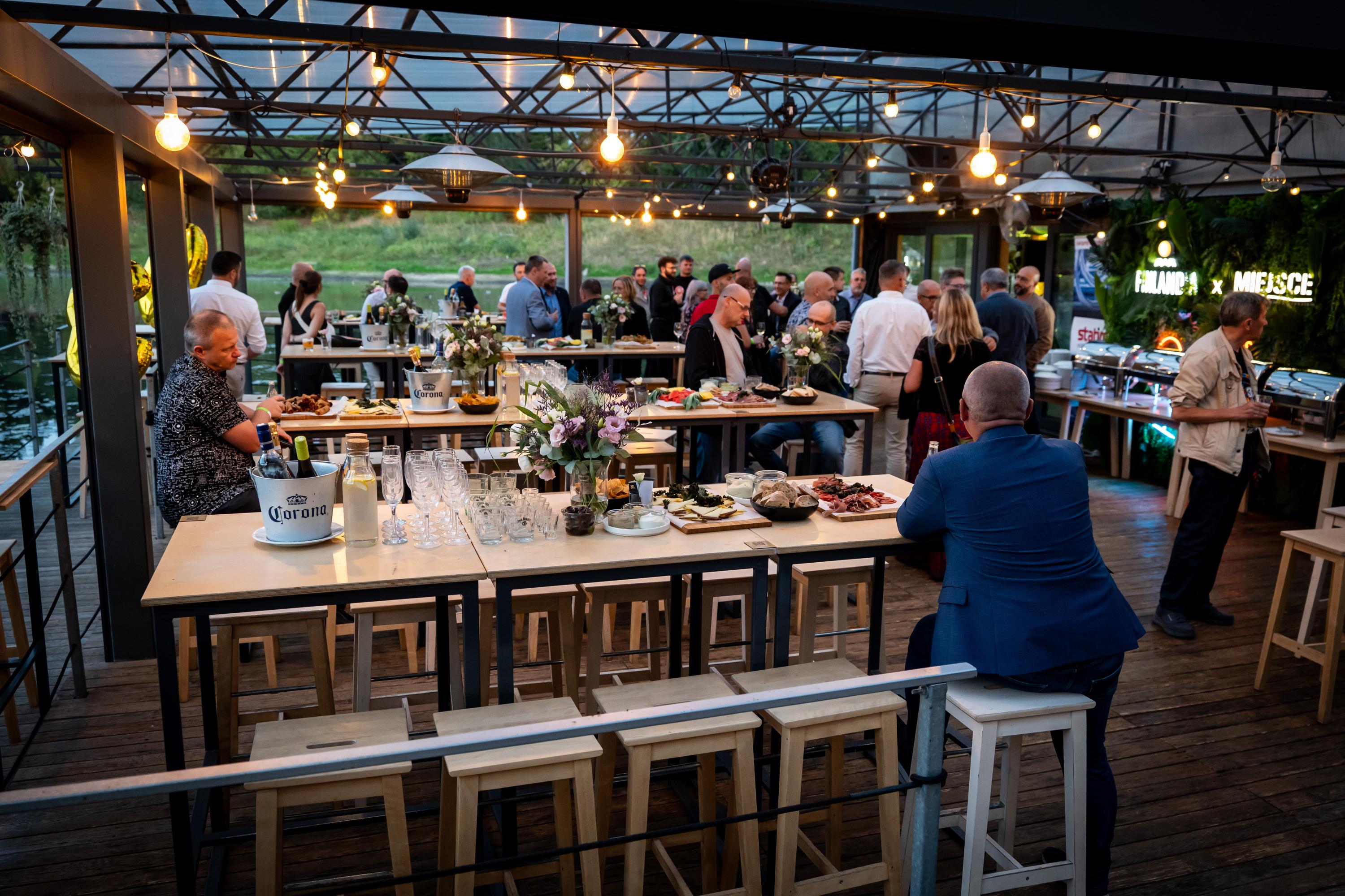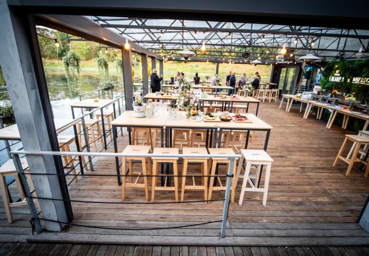 - przestronnego, zadaszonego tarasu (ok. 120 metrów kwadratowych), osłoniętego i ogrzewanego, idealnego nawet dla 100 osób w ustawieniu teatralnym,