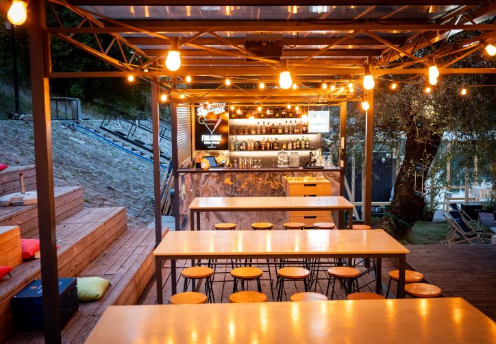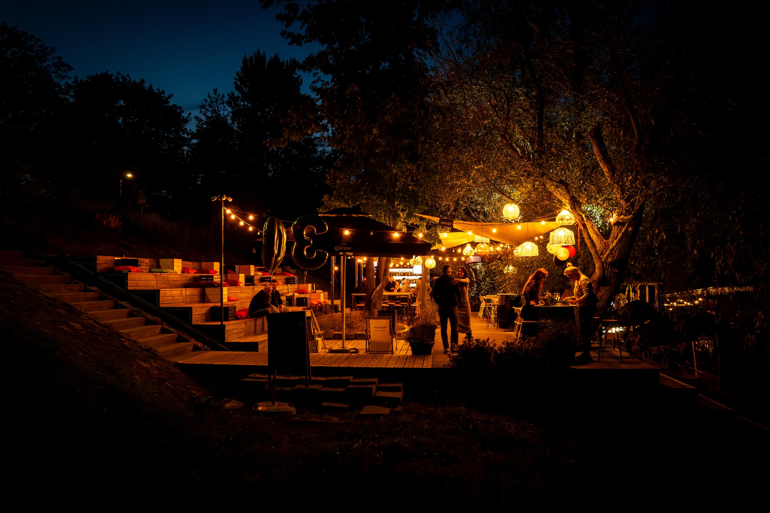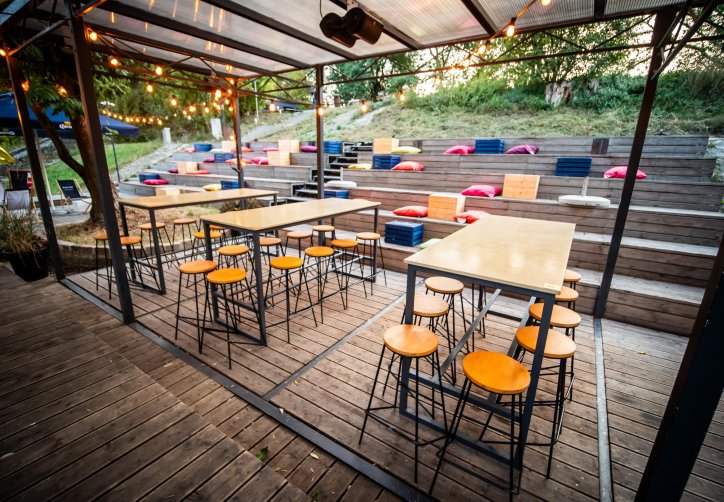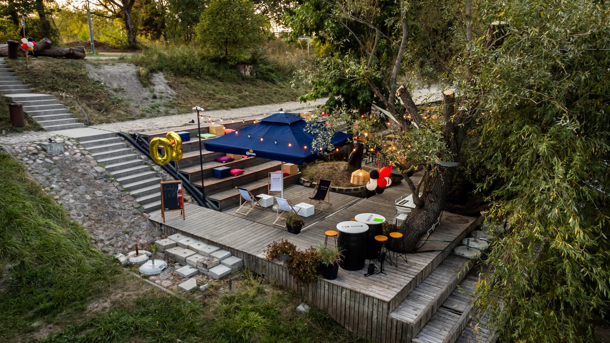 Tuż obok lokalu mieści się kameralna strefa plenerowa z barem i miękkim, nastrojowym światłem — idealna na swobodne spotkania, letnie wieczory z przyjaciółmi czy lekkie eventy pod gołym niebem. Goście mają również dostęp do bezpłatnego parkingu oddalonego o około 50 metrów, co pozwala wygodnie zaplanować wizytę.