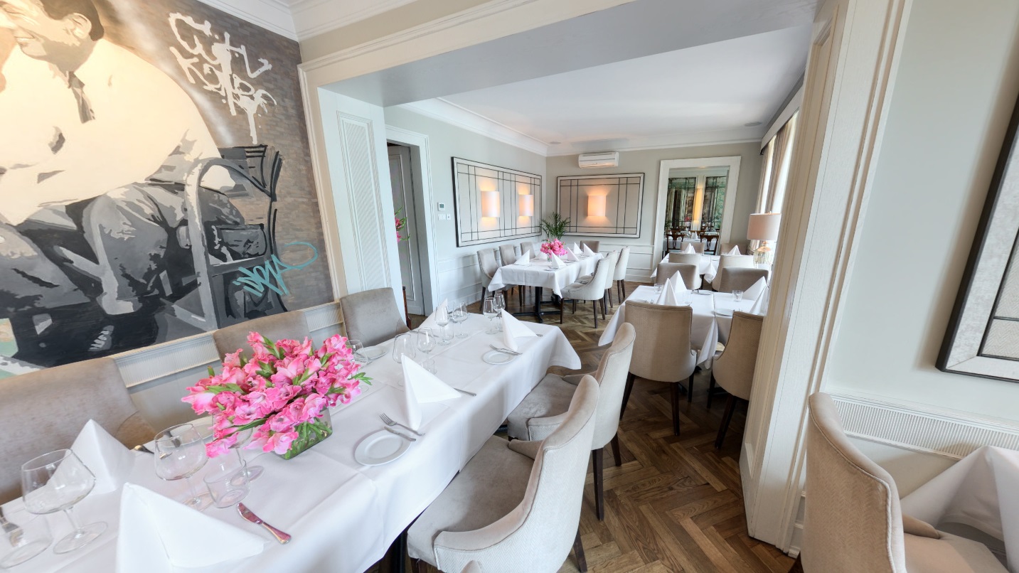 Wnętrze restauracji emanuje romantyzmem i elegancją. Obrusy haftowane w delikatne wzory dodają uroku każdemu nakrytemu stołowi, tworząc atmosferę delikatności i finezji. Subtelne oświetlenie podkreśla kameralny charakter miejsca, zapewniając przytulną aurę idealną zarówno na romantyczną kolację, jak i na spotkanie biznesowe. Muzyka płynąca z pianina dodaje restauracji nuty harmonii i elegancji, dopełniając całościowego doświadczenia.