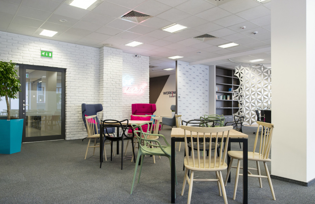 Różnorodne wnętrza pozwalają zarówno na codzienną pracę, jak i na organizację spotkań biznesowych, konferencji, warsztatów, szkoleń oraz eventów.