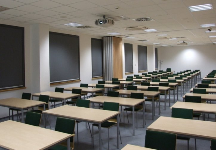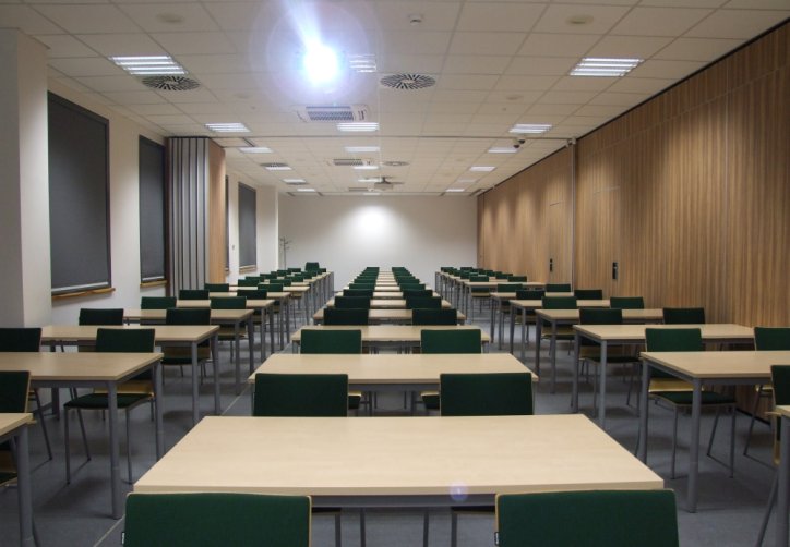 Sale oferują dostęp do światła dziennego, a także możliwość pełnego zaciemnienia, co pozwala na optymalne dopasowanie warunków do potrzeb wydarzenia – od jasnych prezentacji po projekcje multimedialne. Każda sala jest wyposażona w dotykowy panel sterujący, który znajduje się w biurku wykładowcy. Panel ten umożliwia łatwe zarządzanie systemem audio-wideo, roletami i oświetleniem, co ułatwia szybkie dostosowanie ustawień do aktualnych wymagań spotkania.