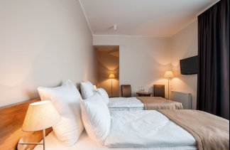 Noclegi: Hotel oferuje do 137 miejsc noclegowych, dostępnych w 2 apartamentach oraz 65 pokojach typu standard i superior. Każdy z nich wyposażony jest m.in. w klimatyzację, telewizor, biurko, telefon, minibar, sejf, Wi-Fi, serwis kawowo-herbaciany oraz zestaw do prasowania. Nowoczesny minimalizm to nasz motyw przewodni – postawiliśmy na stonowane barwy, funkcjonalne wyposażenie i maksymalny komfort. Wygodę snu zapewniają ergonomiczne materace, które doskonale dopasowują się do kształtu ciała, oraz specjalna pościel antyalergiczna. Dla naszych najmłodszych gości przygotowaliśmy dodatkowe udogodnienia, w tym specjalne łóżeczka dziecięce.