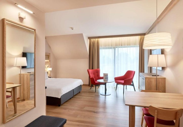 W ofercie znajduję się także 68 apartamentów mieszkalnych, idealnych dla rodzin i grup przyjaciół. Apartamenty, przystosowane dla 2, 4, 5 oraz 8 osób, są wyposażone w aneks kuchenny, co zapewnia gościom pełną niezależność. Te przestronne pomieszczenia usytuowane są w sąsiednim budynku, połączonym z hotelem wygodnym korytarzem, co gwarantuje prywatność. Szczególną uwagę zwraca ekskluzywny apartament z trzema sypialniami o powierzchni 155 metrów kwadratowych, który stanowi idealne miejsce na relaks.
