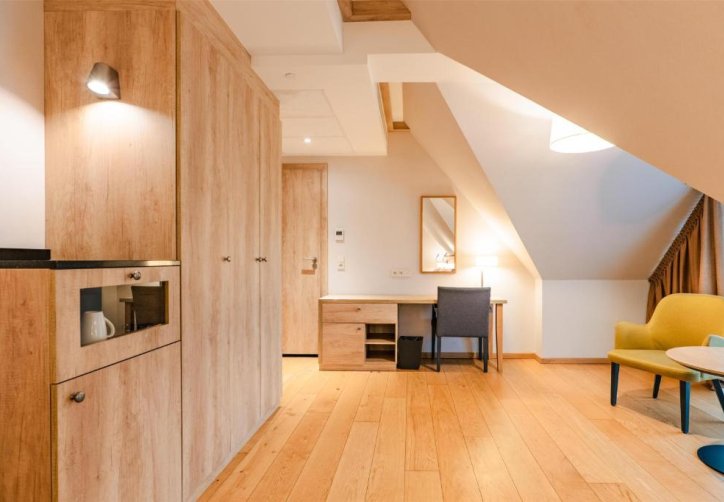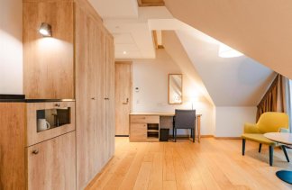 Pokoje są przestronne, klimatyzowane i urządzone w nowoczesnym, eleganckim stylu z górskimi akcentami. Łóżka są bardzo wygodne. W apartamentach dużym atutem jest aneks kuchenny - przy dłuższych pobytach albo wyjazdach integracyjnych to bardzo praktyczne rozwiązanie.