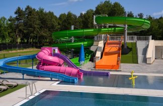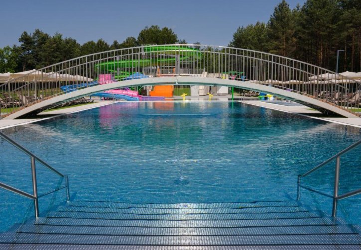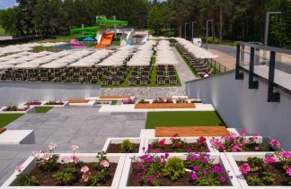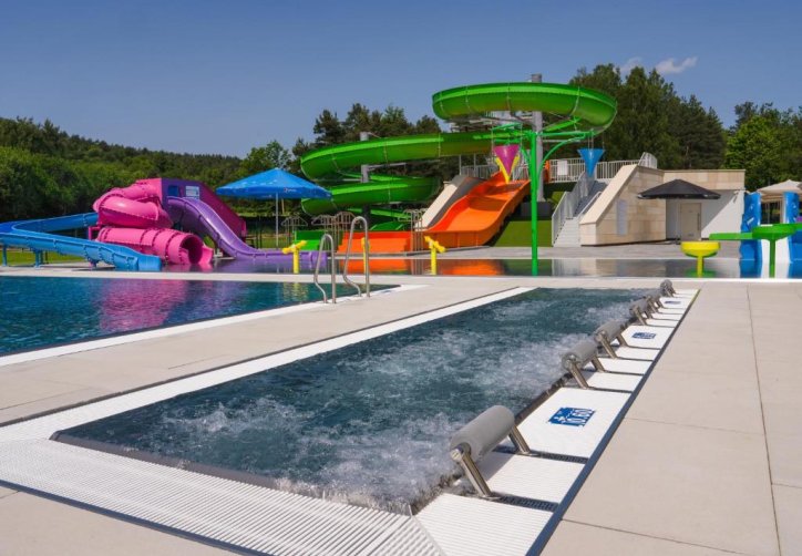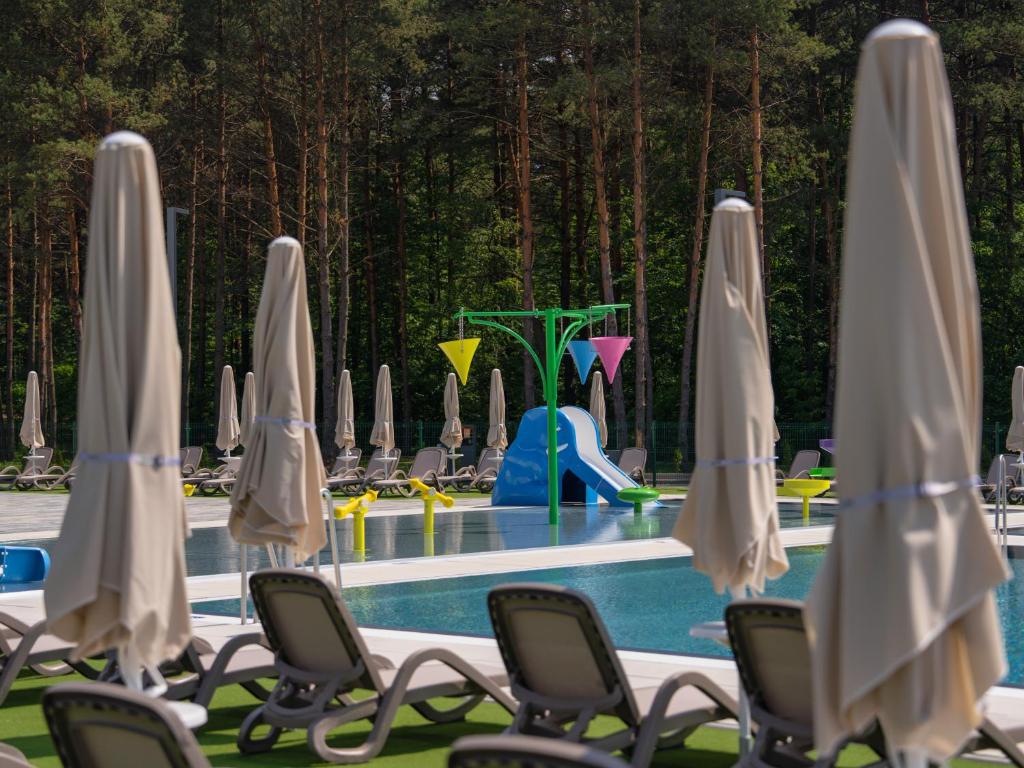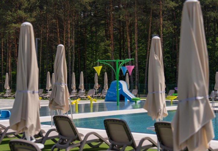 Na terenie kompleksu działają cztery punkty gastronomiczne, a infrastruktura rekreacyjna obejmuje trzy baseny, rozbudowaną strefę SPA z ośmioma gabinetami oraz pole biwakowe o powierzchni przekraczającej 2,5 hektara.