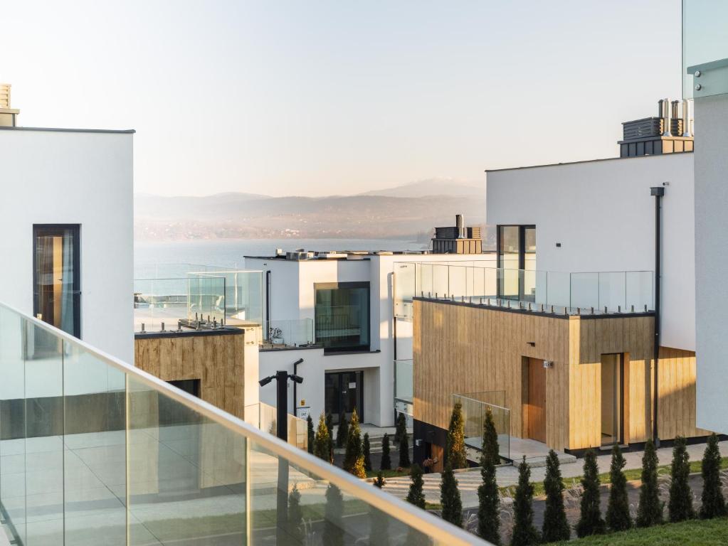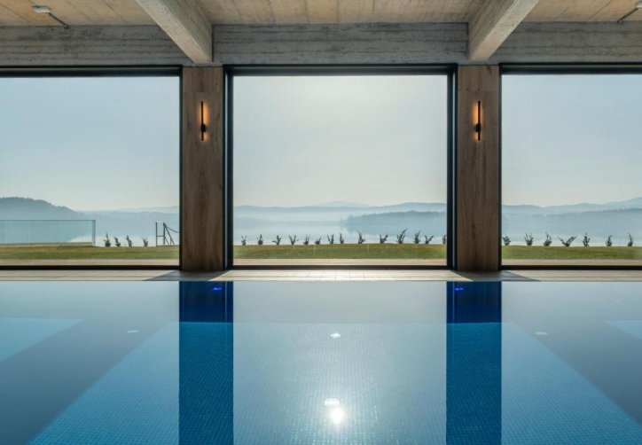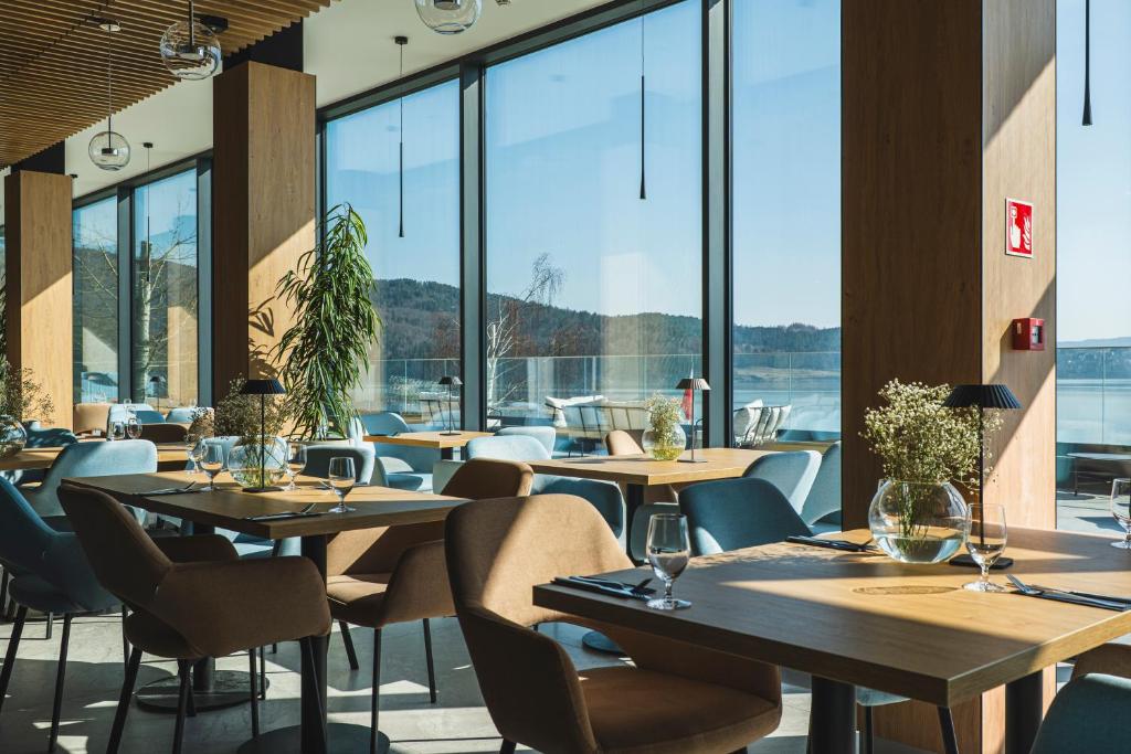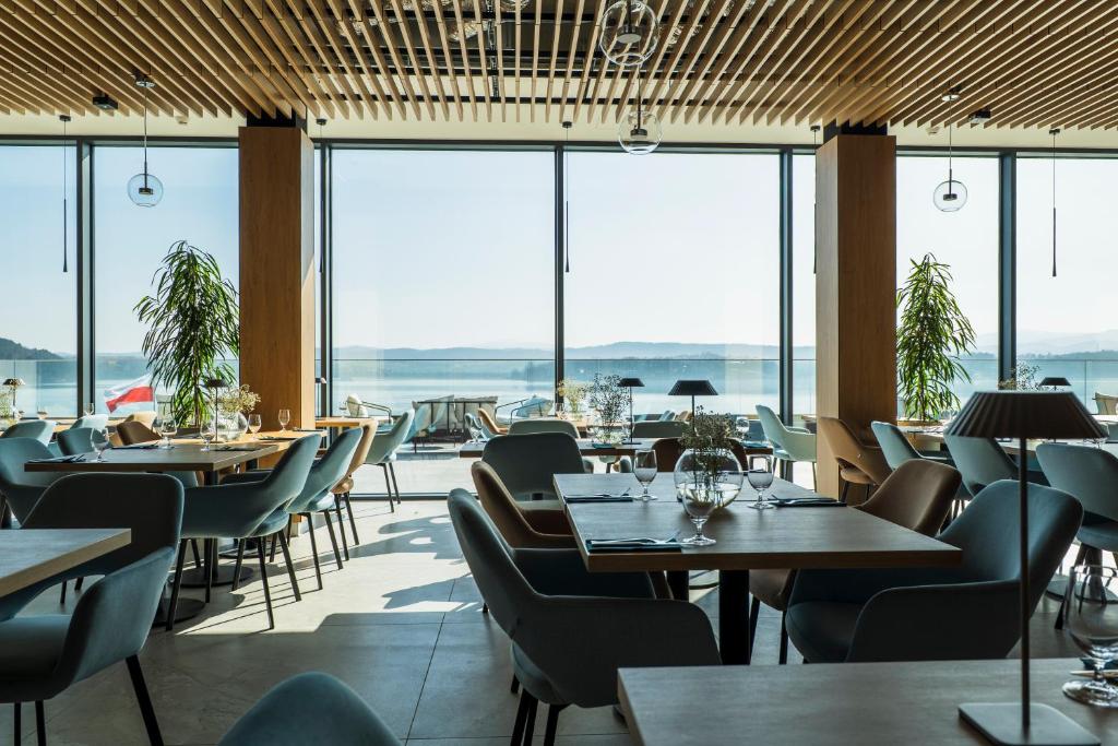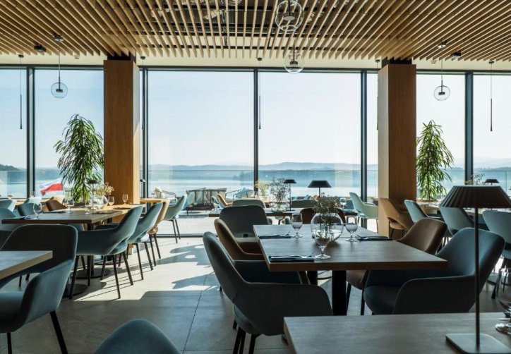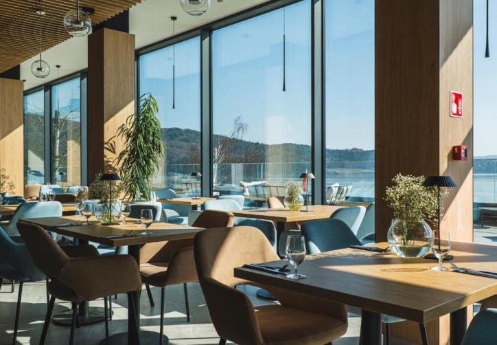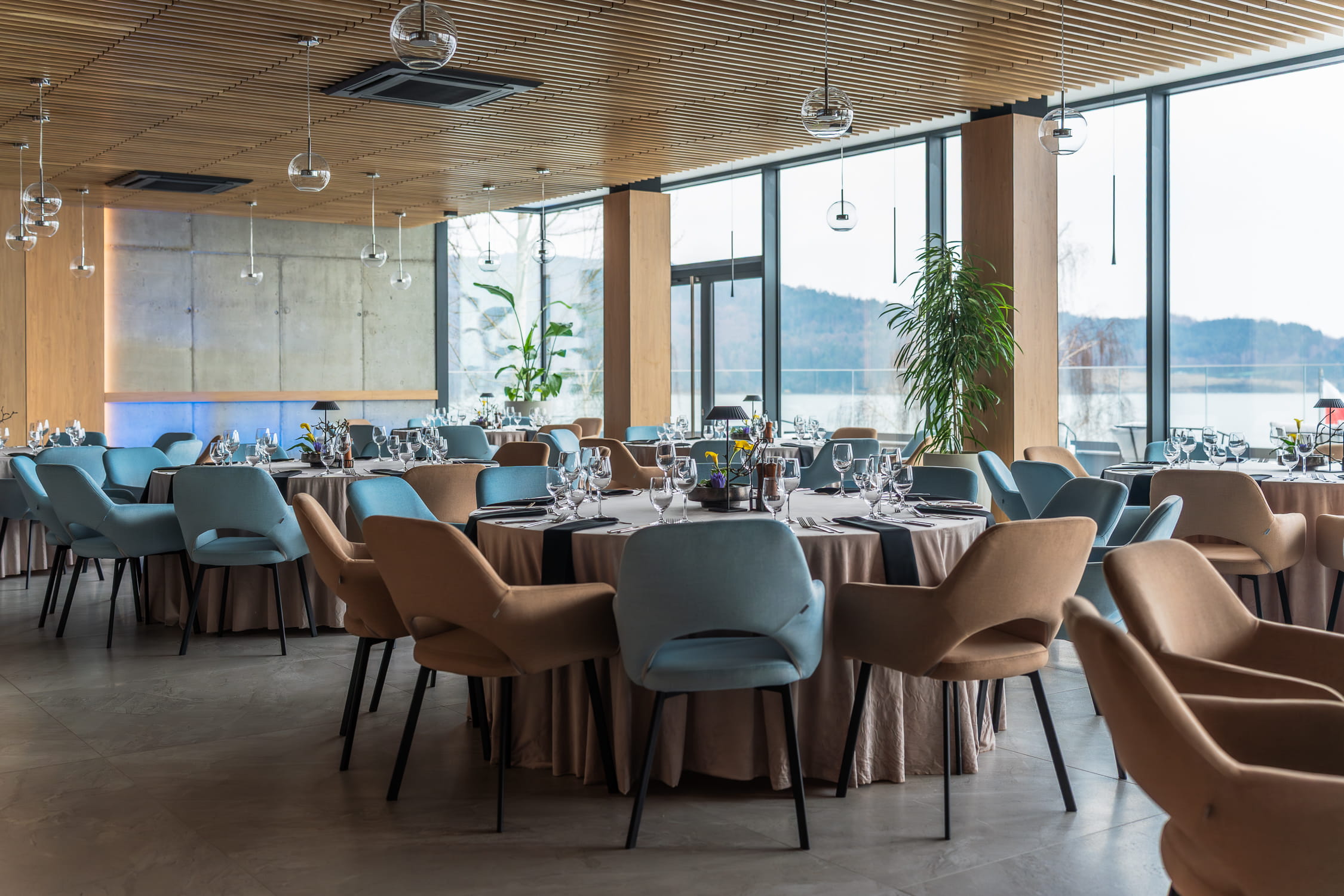 Architektura i wnętrza resortu opierają się na minimalistycznym designie i naturalnych materiałach, dzięki czemu całość nie konkuruje z krajobrazem, lecz go podkreśla. W praktyce oznacza to jasne, dobrze doświetlone przestrzenie, panoramiczne widoki na jezioro oraz atmosferę sprzyjającą zarówno koncentracji podczas spotkań biznesowych, jak i regeneracji po intensywnym dniu.