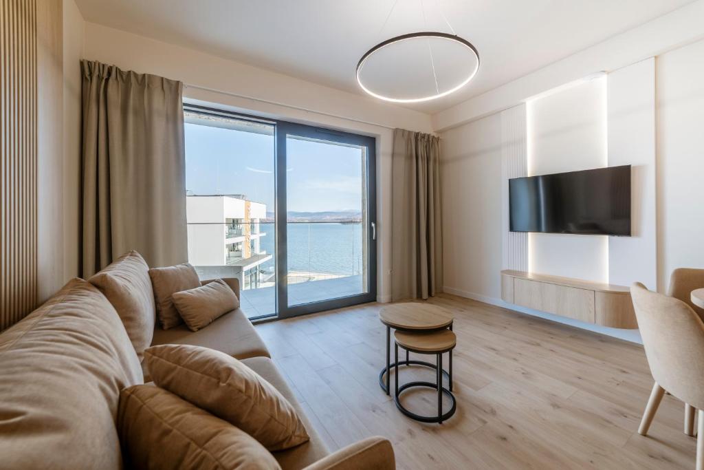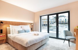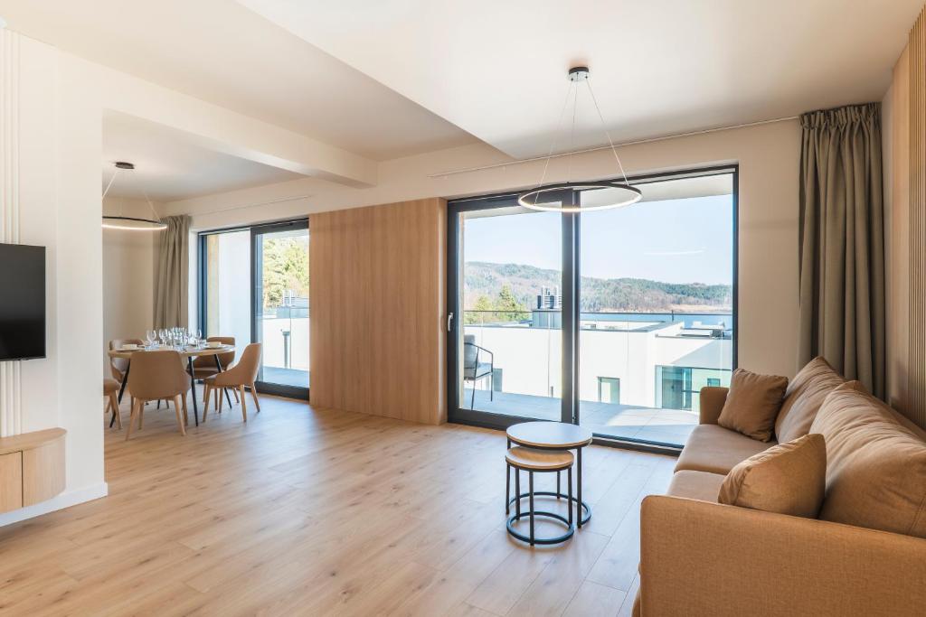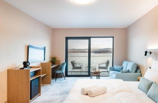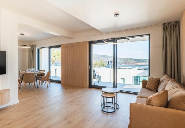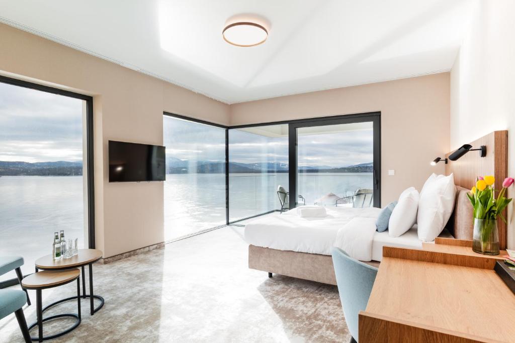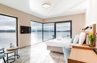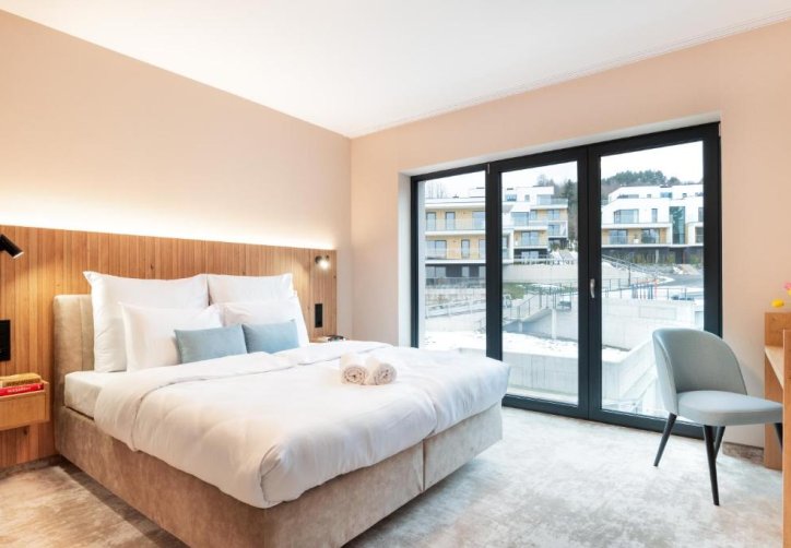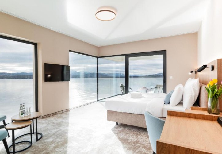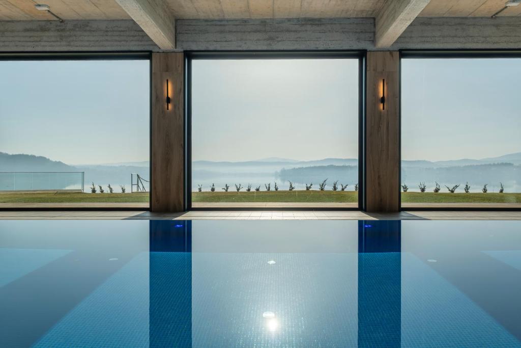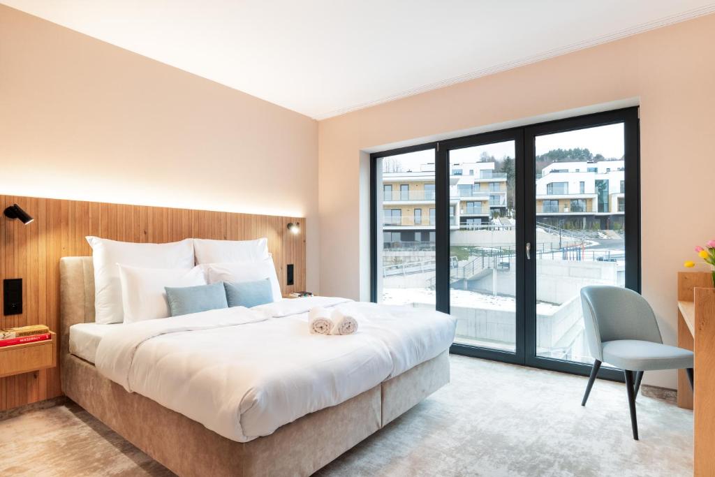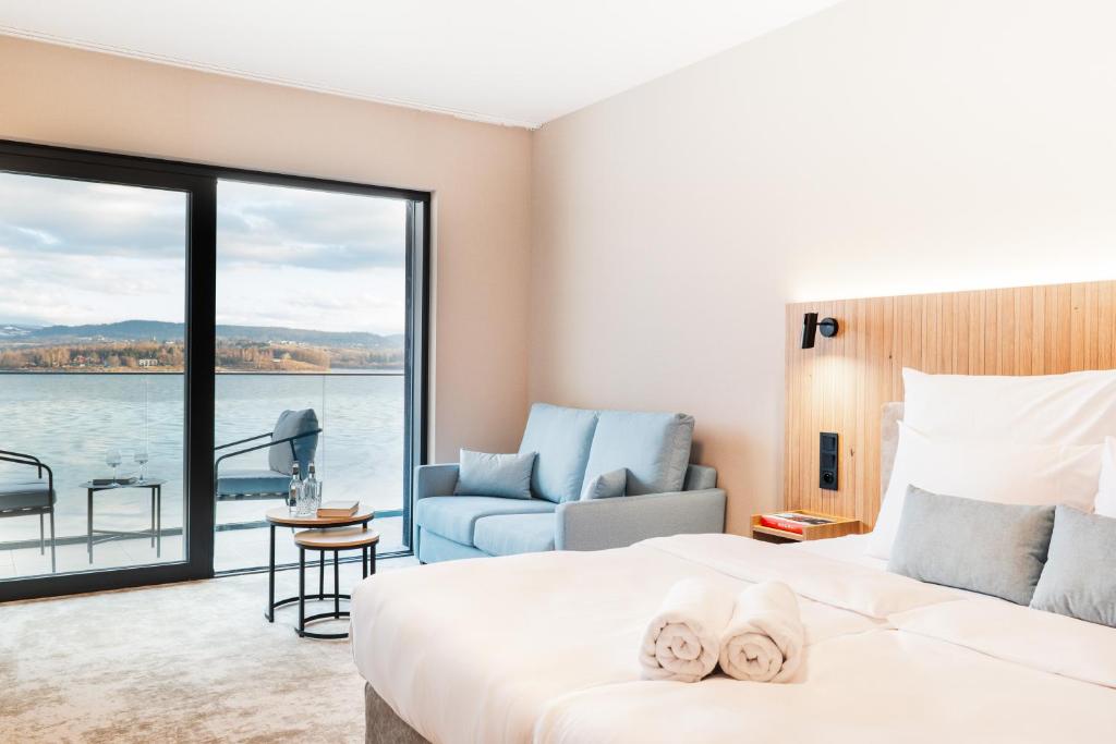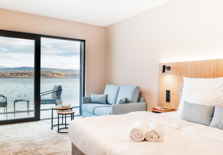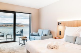Resort oferuje 132 pokoje i apartamenty zaprojektowane z myślą o wygodzie zarówno gości indywidualnych, jak i uczestników wydarzeń biznesowych. Wnętrza utrzymane są w spokojnej, nowoczesnej stylistyce, a duże przeszklenia otwierają pokoje na panoramę jeziora i gór.