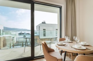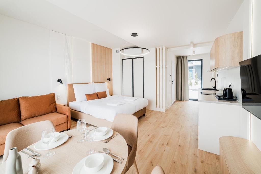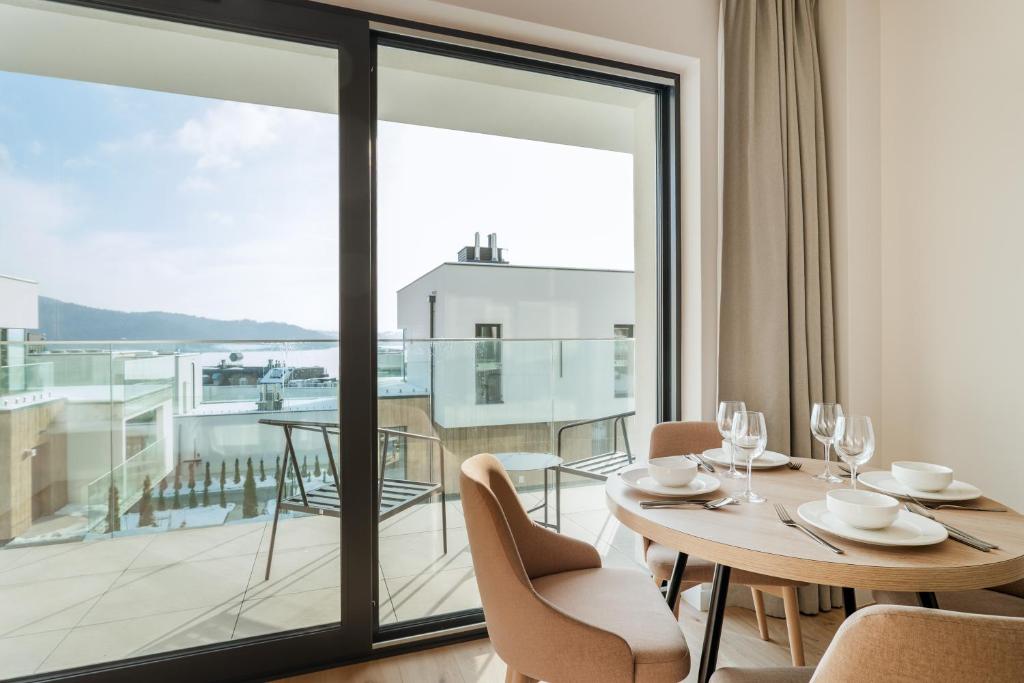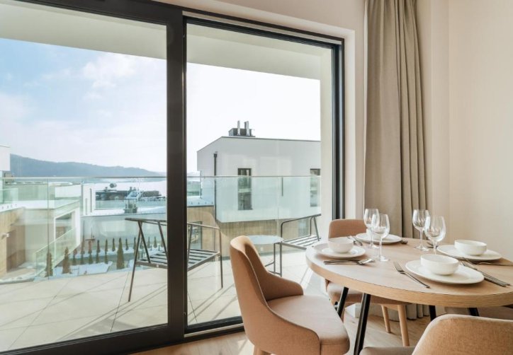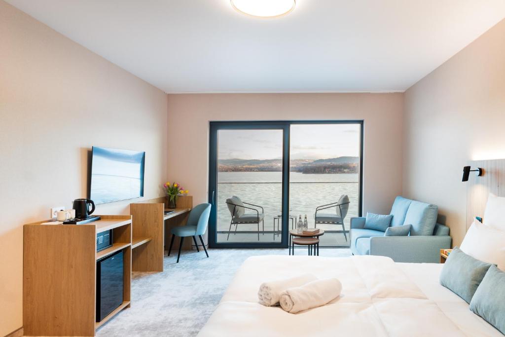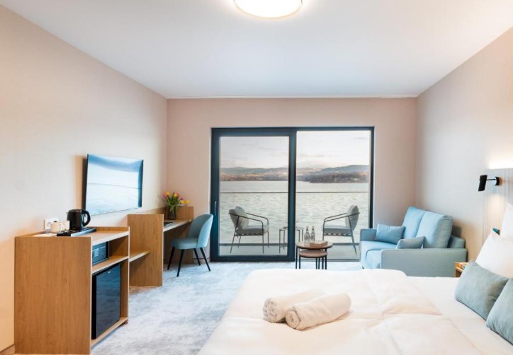 Każdy pokój wyposażony jest w ergonomiczne miejsce do pracy, szybkie Wi-Fi oraz strefę wypoczynkową, co doceniają szczególnie goście łączący pobyt z pracą zdalną lub udziałem w konferencjach. Wiele pokoi posiada balkon lub taras z widokiem na jezioro.